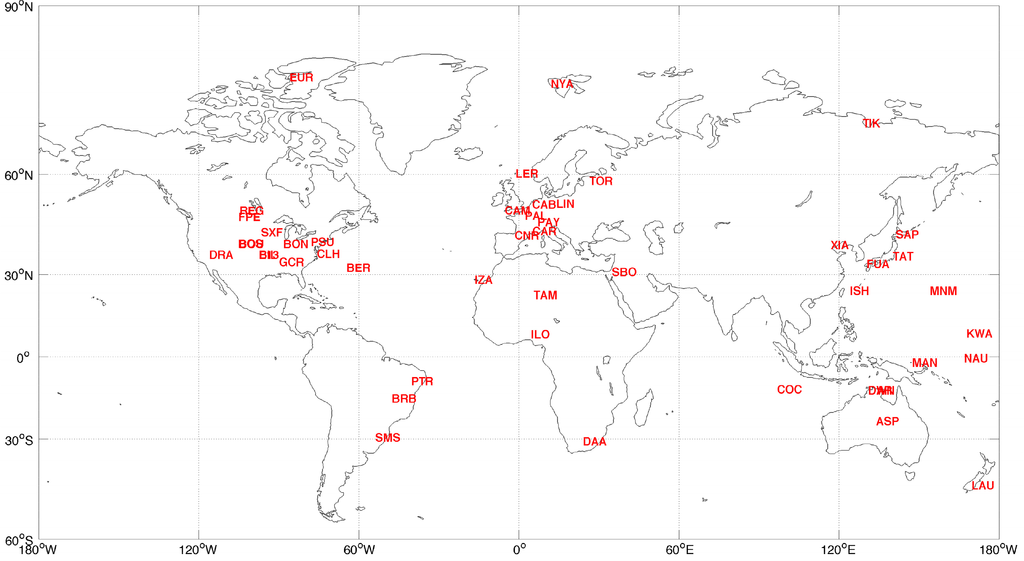 For validation purpose, we collect ground measurements from the Baseline Surface Radiation Network (BSRN) sites [46]. BSRN is a project of the radiation panel of the Global Energy and Water Cycle Experiment (GEWEX) and its member sites whose latitudes range from 80°N to 90°S provide the most comprehensive coverage of the major geographical regions in the world. The components of solar radiation (total, direct normal and diffuse) are continuously measured at these sites at 1 to 3 min intervals. To examine spatial characteristics of the method performance, we choose 48 sites that have available data during the period 2003–2011 and divide them into the following groups according to their geographic locations: (1) Arctic: EUR, NYA, TIK; (2) Islands: KWA, LAU, NAU, BER, CLH, LER, MAN, MNM, SAP, FUA, ISH, COC, DWN, DAR; (3) Continental sites: BIL, BON, BOS, BOU, DRA, E13, FPE, GCR, REG, PSU, SXF, LIN, CAB, CAM, PAL, PAY, CAR, CNR, ASP, DAA, ILO, SBO, TAM, TAT, TOR, XIA, PTR, BRB, SMS. The spatial distribution of these sites is shown in Figure 2. More details of the BSRN sites can be found at http://www.bsrn.awi.de/. Daily mean values of BSRN data are calculated for comparison to reduce large uncertainty caused by varying cloud conditions. Only the days that have above 90% valid observed values are used.