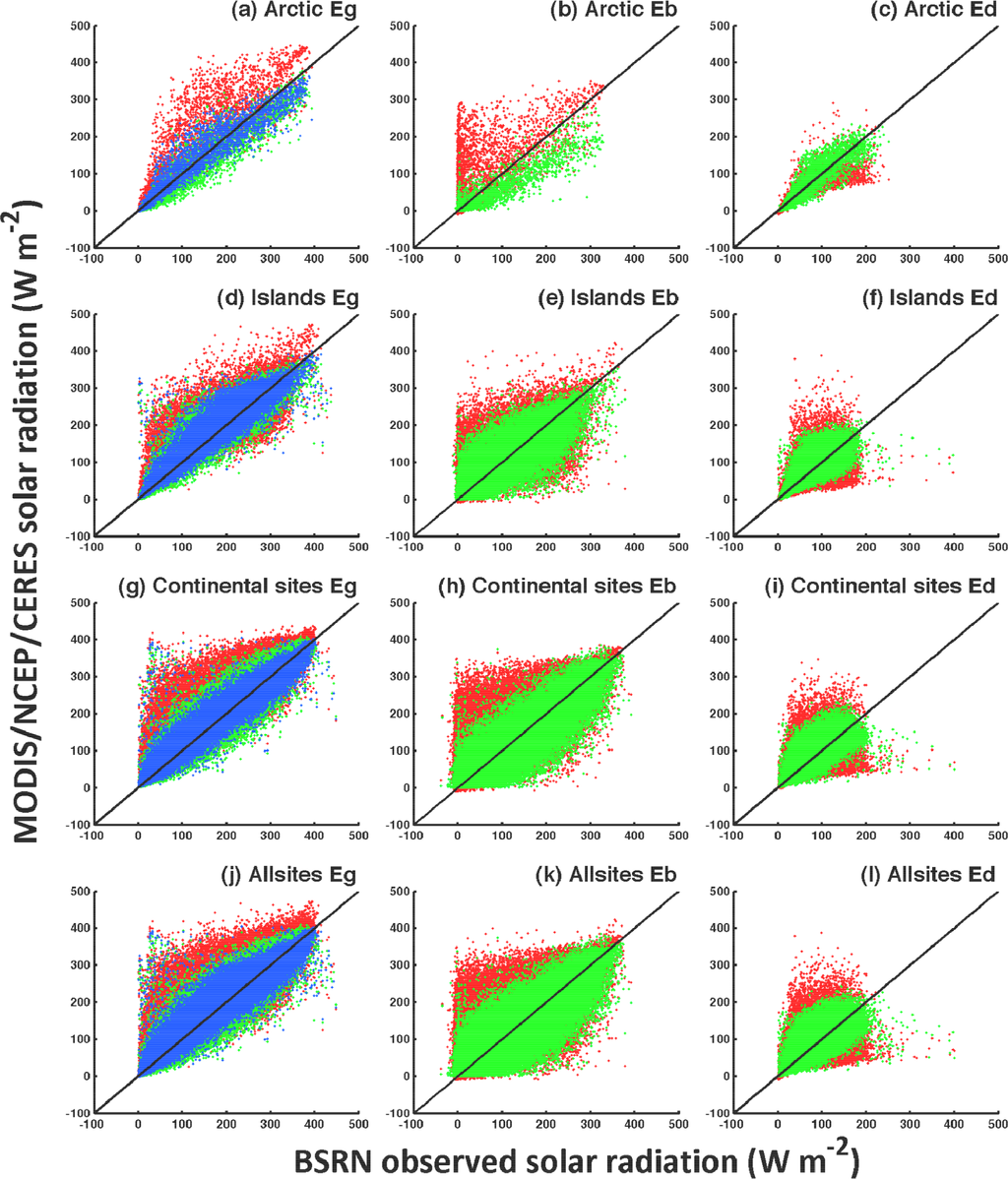Figure 3 shows the scatter plots between the BSRN observations and data from MODIS, NCEP and CERES. Our estimates have comparable performance with the CERES data, which are closer to BSRN observations with lower biases and RMSEs, and higher R2 values (Table 3). The CERES data is more accurate as expected, since CERES has adapted high-frequency geostationary satellite cloud properties in addition to the MODIS cloud products, therefore has utilized more detailed atmospheric profile information, while with our method only uses twice-per-day MODIS atmosphere products. However, our estimates are consistently better than NCEP data at BSRN sites with higher R2 values and lower RMSE values (Table 3). As shown in Figure 3, NCEP data have relatively reasonable estimates of Eg, but its Eb and Ed have large errors. NCEP data has been evaluated by a few previous evaluation studies that indicate NCEP data systematically underestimates cloudiness [6,52,53], therefore less solar radiation is reflected, scattered or absorbed and the land surface could receive more direct beam radiation. This explains the dramatic overestimates of NCEP Eb even when BSRN observes zero direct beam radiation (Figure 3b,e,h), and the overestimates of Eg (Figure 3a,d,g) but underestimates of Ed (Figure 3c,f,i). In addition, since UV radiation is not included in the NCEP data, which is about 3%–5% of total solar radiation (calculated from data in American Society for Testing and Materials G173-08 Reference Spectra http://rredc.nrel.gov/solar/spectra/am1.5/), the actual bias of NCEP Eg after considering UV radiation should be even higher than 38.11 W·m−2 as shown in Table 3.