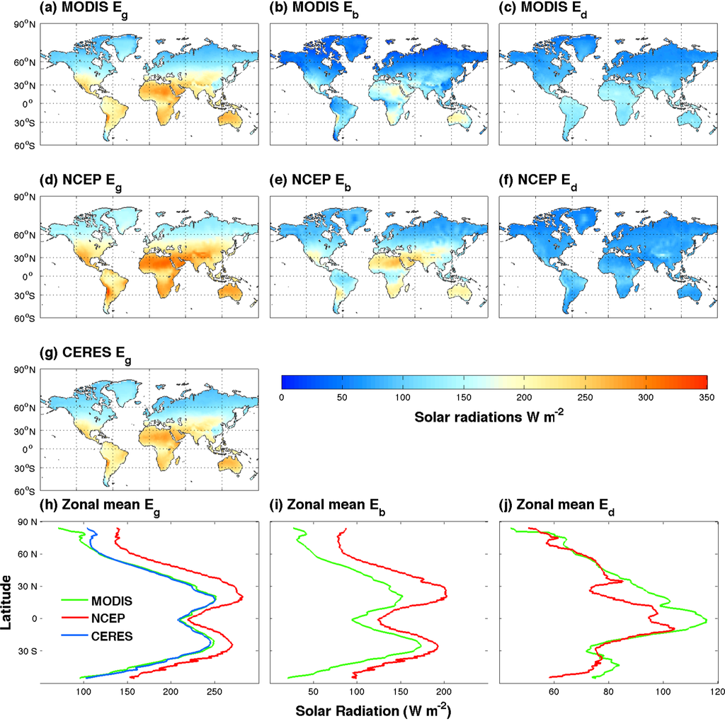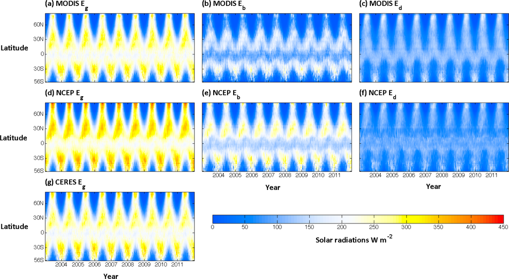 Comparisons show the MODIS data well captured the seasonal change as well as the inter-annual change of solar radiation (Figure 5). In each image of Figure 5, each row of pixels shows the global zonal mean values across the study period (from 2003 to 2011). The highest and lowest solar radiation estimates alternately occur in high-latitude regions because of polar days and nights. Zonal means of solar radiations are low in equatorial regions due to the small area of land. Consistent with the above findings, MODIS Eg matches the CERES Eg very well at both spatial and temporal domain while exhibiting magnitude difference comparing with NCEP data. MODIS-NCEP difference of Eg is mostly located in middle-latitude and low-latitude regions in the middle of a year, mainly attributed to the differences of Eb in these regions and the compensation from the differences of Ed. These findings are consistent with previous comparisons of NCEP data with ISCCP/GISS data [6].