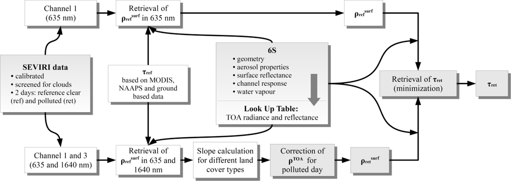 - Goevarts, Y.M.; Wagner, S.; Lattanzio, A.; Watts, P. Joint retrieval of surface reflectance and aerosol optical depth from MSG/SEVIRI observations with an optimal estimation approach: 1. Theory. J. Geophys. Res 2010, 115. [Google Scholar] [CrossRef]