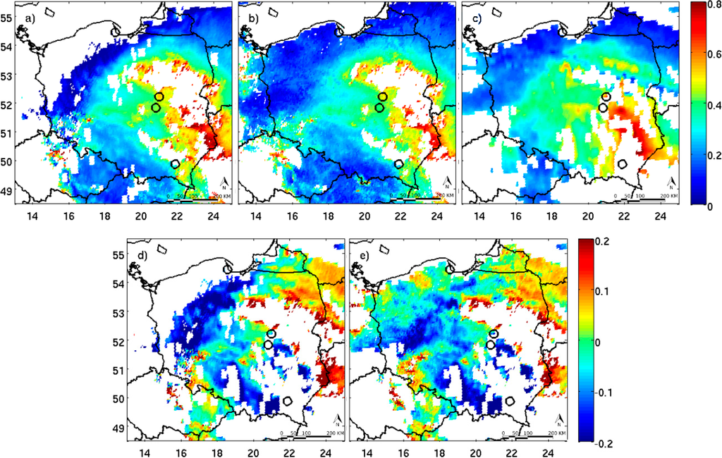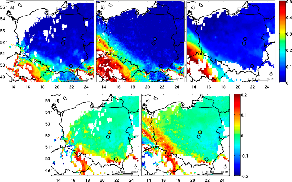 The relatively clear polar air masses were strongly transformed over Central Europe due to anthropogenic emission in the very slow anticyclone circulation and under large subsidence [42]. The back-trajectories from the NOAA-HYSPLIT (Figure 10) [62] which ended in Warsaw at 12:00 UTC show that the air mass at 500 m (blue dots) and 3000 m (blue open squares) took about 70 h and 65 h, respectively, to travel across Poland (and partly Slovakia, the Czech Republic and eastern Germany) before it reached Warsaw. During the night from 3–4 April, the WMO Legionowo station (about 20 km from Warsaw) reported a very strong and low-level inversion with a temperature jump of 10.2 °C in the surface layer with a depth of 80 m. This situation as well as the local emission are responsible for the significant spatial distribution of the AOD greater aerosol concentration close to the surface. Figure 11a shows profiles of the aerosol backscatter coefficient at 1064 nm measured between 00:00–01:00 UTC (solid line) and between 19:00–20:00 UTC (dotted line) obtained from the CHM15K ceilometer in Warsaw. Both profiles indicate a high value of the aerosol backscatter coefficient close to the surface (0.01–0.02 km−1·sr−1) and a significant decrease with altitude. The atmosphere above 1.2 km was very clean. Figures 12 and 14 shows the SEVIRI AOD obtained for 1- and 2-channel methods on 4 (Figure 12a,b) and 30 (Figure 13a,b) April and 1 May (Figure 14a,b), as well as the SEVIRI and the MODIS difference for both algorithms. The spatial distribution of the SEVIRI AOD obtained by the one-channel method (Figure 12a) includes a lot of gaps due to cloudy conditions on the reference day (2 April). However, the two-channel method provided almost a full set of the AOD data (Figure 12b). The AOD varies between 0.1 and 0.55 with a maximum over southeast Poland. The local maxima are visible close to large Polish cities (e.g., Warsaw, Poznan, Lodz, Wroclaw) but also in Berlin, Dresden and Prague. To determine the difference between the SEVIRI and the MODIS AOD we computed the MODIS AOD (Figure 12c) at 635 nm from the AOD at 550 nm and the Ångstrom exponent measured only by CIMEL at the Belsk station. In 2009, data from the Poland-AOD network was not yet available. The AOD difference in the case of both algorithms changes significantly between −0.2 and 0.2 (Figure 12d,e). However, for the majority of pixels the difference is less than ±0.05, and negative values dominate in the western and positive ones in the eastern part of the region. For the area close to the Belsk station, the difference between the SEVIRI and CIMEL AOD is 0.01 and −0.04 for the one- and two-channel methods, respectively.