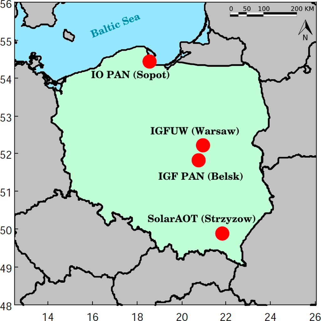 5.1. AOD Validation in the Framework of the Poland-AOD Network