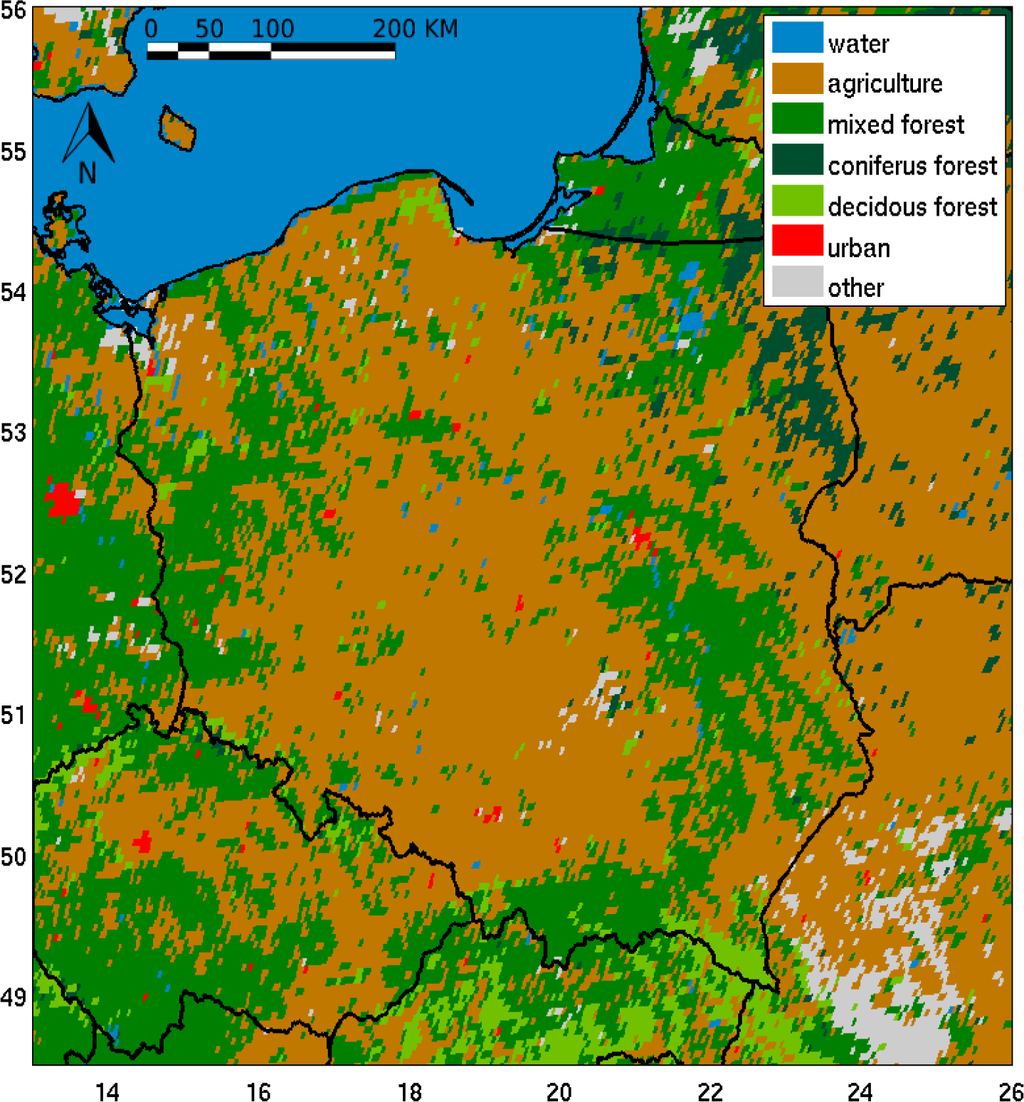 The retrieval of the AOD requires information about surface optical properties as well as the type of land cover. For this purpose, data from the Land Cover Map for Europe [52] created by the USGS (United States Geological Survey) was used to define areas of different surface cover types in Poland. Based on a high-resolution map (1 km spatial resolution), the most frequent types of land covers for boxes of the SEVIRI resolution size (about 5 × 5 km) were chosen (Figure 3). The acquired data allowed us to estimate the surface reflectance as described in the next section.
