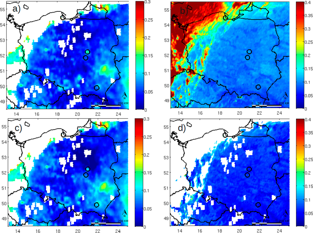 Because of the significant uncertainty of the AOD retrieved from the MODIS data, we corrected this information using surface observations. For this purpose, the AOD measurements from Belsk, Sopot, Warszawa and Strzyzow were used (Figure 2). The Belsk and Strzyzow (since August 2013) stations belong to the AERosol RObotic NETwork-AERONET [38] and beside Belsk, the three stations belong to the Poland-AOD national network [39]. The AERONET is one of the most widespread aerosol networks [40], which uses CIMEL Electronique 318A sun photometers [41]. These are multi-channel, automatic sun-and-sky scanning radiometers that measure the direct solar irradiance and sky radiance at the Earth’s surface. Solar radiation is measured at seven wavelengths (380, 440, 500, 675, 870, 936 and 1020 nm). The AOD is retrieved from six channels. For the purpose of this paper we present data from level 2.0 of the data quality assurance. The Poland-AOD [42] was officially established in 2011, but observations of aerosol optical properties and radiation fluxes have been performed since 2007. This network currently includes three stations: Sopot (Baltic coast), Warsaw (central Poland, urban type) and Strzyzow (southeast part of Poland, rural mountain type). Multifilter Rotating Shadowband Radiometers (MFR-7) are used to measure the AOD within the Poland-AOD [43]. These instruments have six narrow-band channels (415, 500, 610, 675, 870 and 940 nm) and one broadband channel to measure direct, diffuse and total solar radiation. In addition to the continuous MFR-7 measurements, irregular observations with hand-held Microtops sun photometers [44,45] are performed. These instruments provide the AOD from the direct solar measurements at 380, 500, 675, 870 and 1020 nm. An important issue in data quality assurance involves the proper calibration of the sun photometers. The calibration coefficient of the Microtops instruments was derived during different field campaigns and routine calibrations within the Poland-AOD network. The calibration coefficient may produce a significant systematic error, in particular for small solar zenith angles. However, in the case of our Microtopses, the calibration coefficients did not change significantly between Langley calibrations. Therefore, the AOD uncertainty estimated based on the Langley calibration coefficient variability and signal standard deviation was ±0.01 for all channels. The MFR-7 instruments are regularly calibrated in situ with the Langley method [46]. However, due to the significant degradation of diffuser and filter optical properties that influence the channel sensitivity, as well as to the temporal cosine zenith correction, the uncertainty of the retrieved AOD is higher than that of the Microtops instruments. Based on the sensitivity study, and in comparison to the CIMEL instrument, it was estimated at the level of ±0.025.