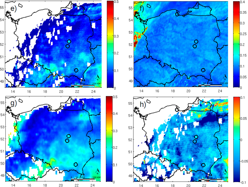 Exemplary successive steps of the surface reflectance and AOD estimations are presented in Figure 3. For the clear reference day, differences between the aerosol optical depth from MODIS before (Figure 4a) and after optimal interpolation (Figure 4c) are shown. TOA reflectance and estimated surface reflectance are shown on Figure 4b,d, respectively. In the case of the retrieval day, AOD SEVIRI (Figure 4e) and MODIS (Figure 4g) were compared. Figure 4h shows the differences between 0.02 and −0.02 for most parts of Poland. Additionally, a map of TOA reflectance is presented (Figure 4f).