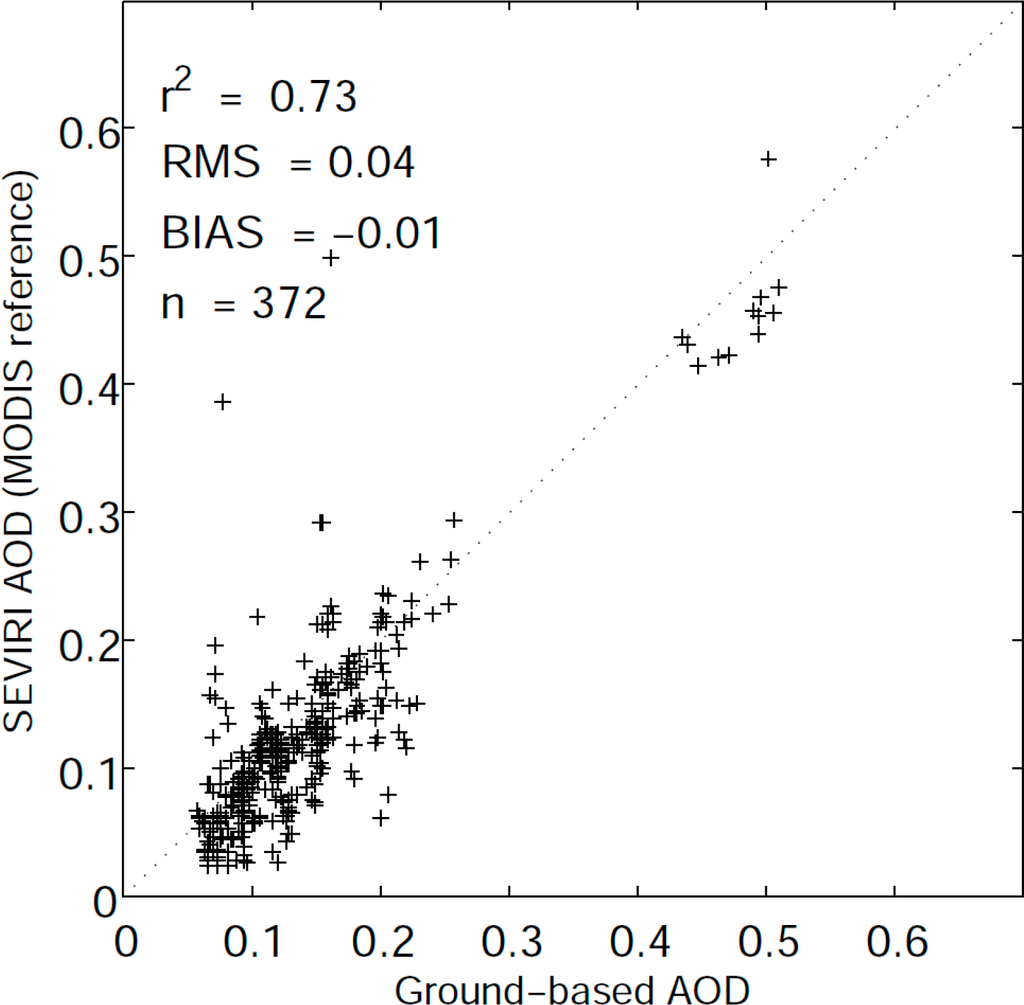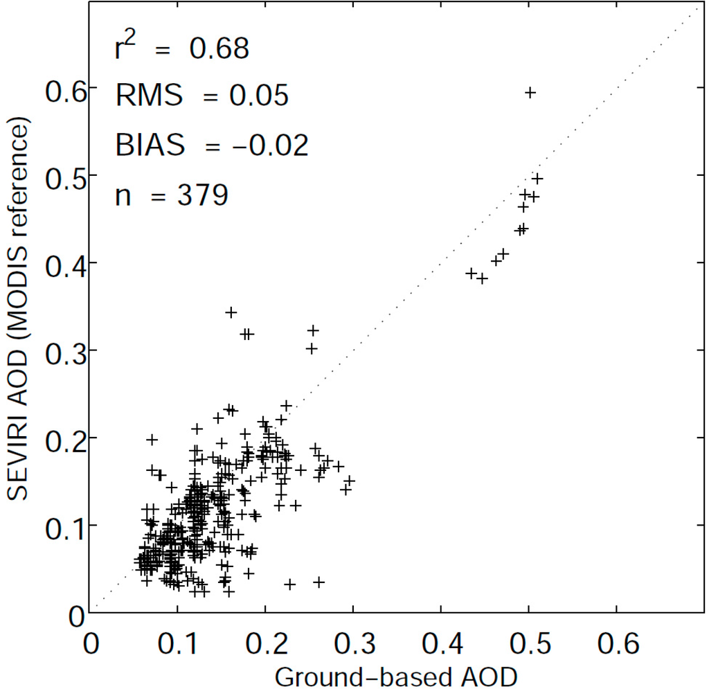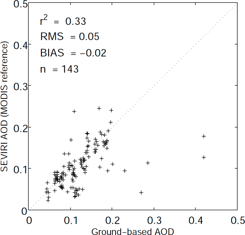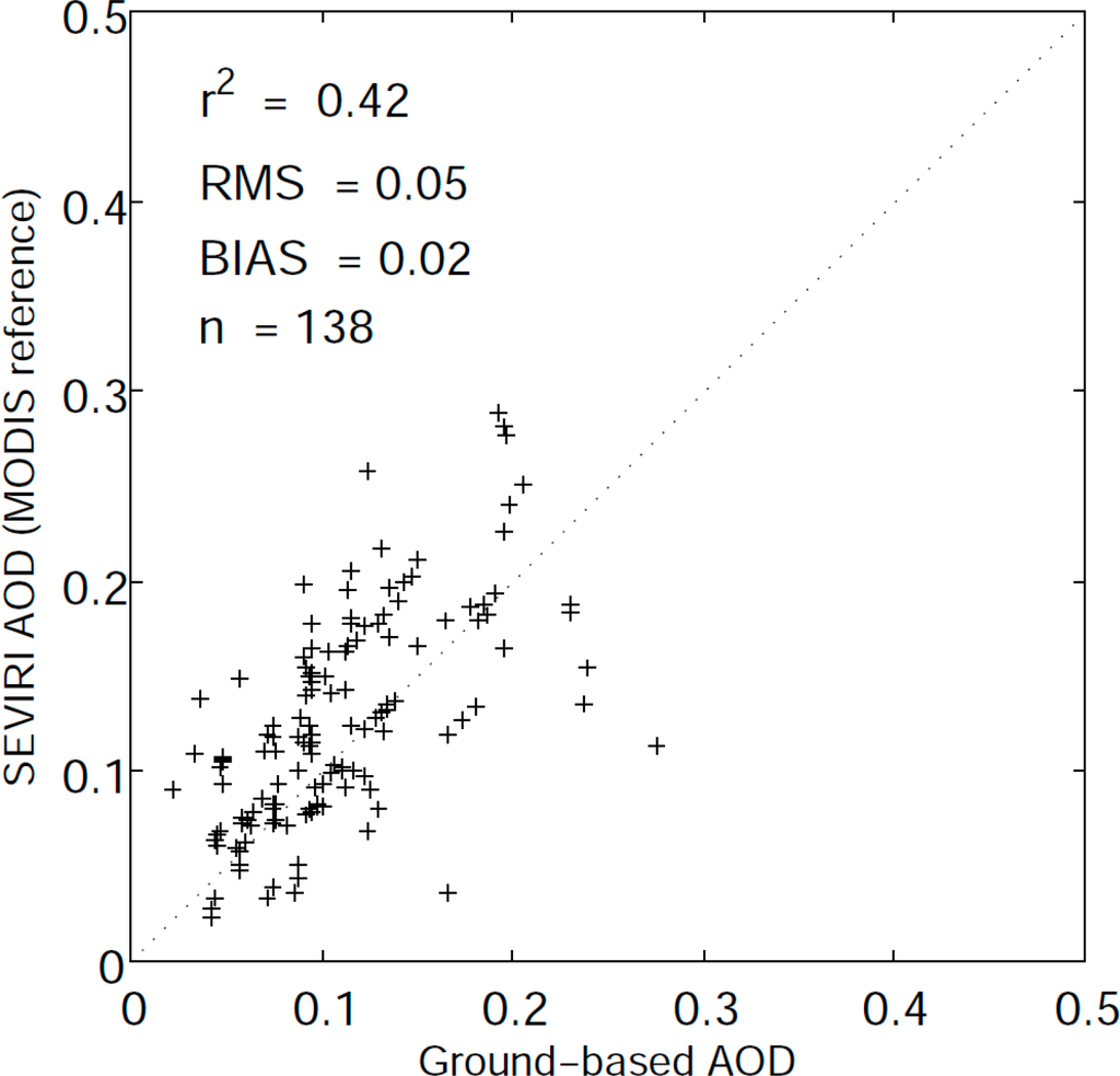 The difference between the SEVIRI and the MODIS AOD can be explained by the uncertainty of the Ångstrom exponent used to scale the MODIS 550 nm to 635 nm value and also by the fact that the MODIS tends to overestimate small AODs and underestimate high AODs [8,33,65]. The regression between the MODIS and the AERONET AOD at 550 nm is τMODIS = 0.1 + 0.9τAERONET [65]. Thus, for a low AOD, the difference between the SEVIRI and the MODIS tends to be negative, and for a high AOD the difference becomes positive.