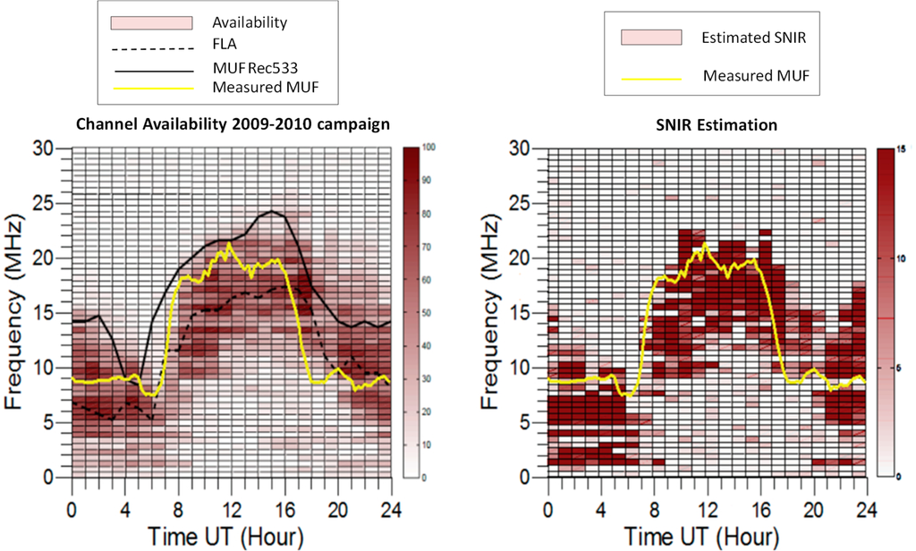 In this section we synthesize the results for both narrowband and wideband oblique sounding. Exhaustive results can be found in [19,20]. We note that the oblique ionospheric sounding study provided results in terms of (i) availability of the channel, crucial to improve transmission; and (ii) multipath and Doppler spread, being the multipath spread a limit for symbol period and the evaluation of coherence time using the Doppler spread as a reference to build the frame data blocks.