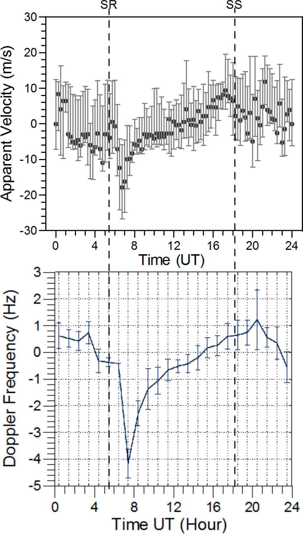 Other results obtained by the team show significant correlation of the MUF(3000)F2 recorded by VIS with signal to noise ratio of the HF radio link established between the ASJI and Spain (SNR) as can be shown in Figure 10, right. This fact jointly with the aforementioned results presented in [57] motivates us to future development of models for predicting the best frequencies for establishing the HF radio link between the ASJI and Spain. Moreover, we found additional correlation between observations by the OIS and by VIS at the receiving site. Thanks to the upgrade of the OIS with more accurate clocks and better GPS for synchronization, it was possible to analyze the time of flight and the Doppler shift and to notice that the Doppler shift suffered for the radio link between ASJI and Spain correlates with the vertical drift velocity of the ionospheric F region over the receiving site in Spain (see Figure 11). Altadill et al. [59] show details on the measurements of the F-region vertical drift velocity and the results of its daily pattern.