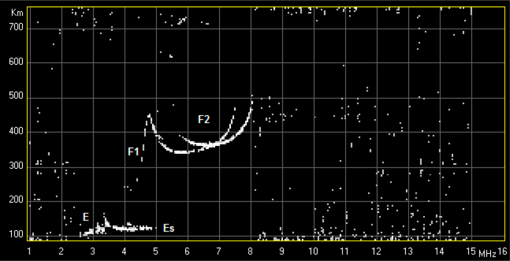 The VIS installed at the ASJI runs only when the station is attended, usually from December through early March, recording vertical incidence ionograms at 10 min sampling (see Figure 2). The ionograms are graphs representing the time-of-flight against transmitted radio frequency reflected in the ionosphere from which one extracts the ionospheric characteristics [18]. The measured characteristics are the lowest frequency observed in the ionogram (fmin), the critical frequencies of the ionospheric layers E, Es, F1 and F2 (foE, foEs, foF1 and foF2, respectively), the virtual (or group) heights of the ionospheric layers E, Es, F1 and F2 (h’E, h’Es, h’F1 and h’F2, respectively), and the maximum usable frequency for a single hop transmission at 3000 km reflected at the F2 layer (MUF(3000)F2). Note that the virtual heights (h’) give an estimation of the height at the bottom of the respective ionospheric layer and the critical frequencies (f0) are related to the maximum electron density (Nm) of the particular ionospheric layers by the following well known expression: , where density is expressed in m−3 and frequency in Hz. We refer the reader to [15] for more details.