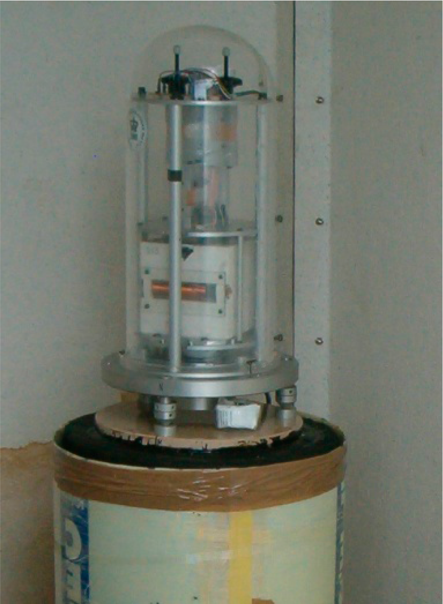 Figure 3. The triaxial fluxgate variometer at LIV.- Proton precession magnetometers (PPM) are based on the intrinsic dipole magnetic moment of protons precessing around the ambient magnetic field, thus measuring the total magnitude F of the geomagnetic field with typical accuracies of 0.2 nT. When coils (usually two mutually perpendicular pairs of Helmholtz coils) are placed around them, a known current produces a known magnetic field that is superimposed to the natural one. Measurement of the resulting total field with the PPM allows determining variations of the declination and inclination angles. Two PPMs are used at LIV, which are sampled every ten seconds: one of them is a single scalar PPM to just measure F; the other is placed within two sets of Helmholtz coils, which produce a complete cycle of measurements including F, I and D every minute, constituting a variometer known as Proton Vector Magnetometer in δD/δI (or deltaD/deltaI) configuration.