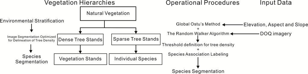 Two critical limitations of very high resolution imagery interpretations for time-series analysis are higher imagery variances and large data sizes. Although object-based analyses with a multi-scale framework for diverse object sizes are one potential solution, more data requirements and large amounts of testing at high costs are required. In this study, I applied a three-level hierarchical vegetation framework for reducing those costs, and a three-step procedure was used to evaluate its effects on a digital orthophoto quadrangles with 1 m spatial resolution. Step one and step two were for image segmentation optimized for delineation of tree density, which involved global Otsu’s method followed by the random walker algorithm. Step three was for detailed species delineations, which were derived from multiresolution segmentation, in two test areas. Step one and step two were able to delineating tree density segments and label species association robustly, compared to previous hierarchical frameworks. However, step three was limited by less image information to produce detailed, reasonable image objects with optimal scale parameters for species labeling. This hierarchical vegetation framework has potential to develop baseline data for evaluating climate change impacts on vegetation at lower cost using widely available data and a personal laptop.1. Introduction