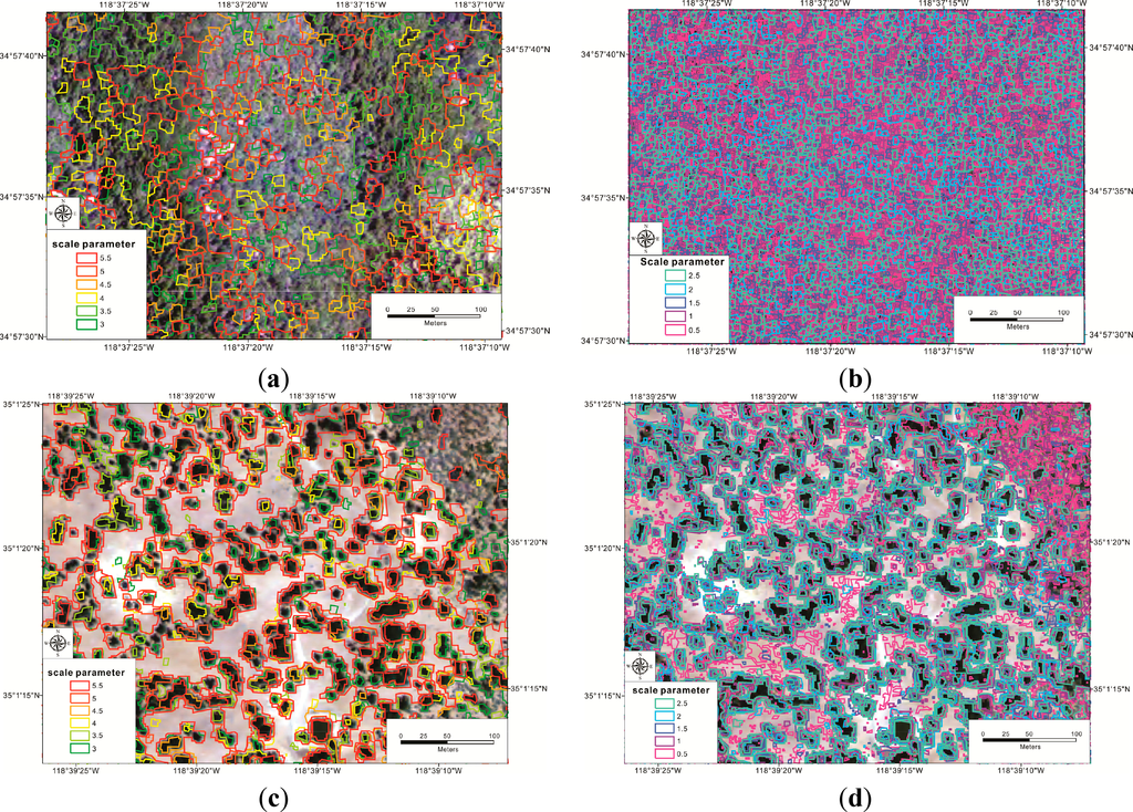 Different tree density distributions will have different optimal scale parameters for image segmentation where the optimal scale parameter was that with the lowest segmentation variances and spatial autocorrelations [66–68]. The hypothesis was based on studies indicating that different image objects, such as sizes of tree crowns or clumps are a function of different spatial scales [10].