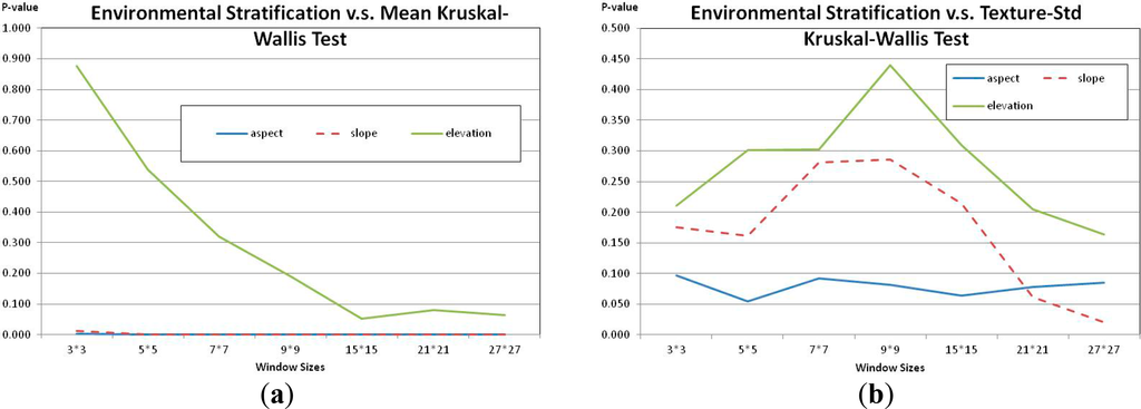 To test the hierarchical vegetation framework and the three hypotheses, a series of evaluations were used. First, image local DN and texture, mean and standard deviation in the first band, were used. The local mean and standard deviation were calculated based on window sizes, 3 by 3, 5 by 5, 7 by 7, 9 by 9, 15 by 15, 21 by 21 and 27 by 27. The goal was to see which terrain variable could be used to stratify the image most effectively, because image DN and texture correlates with forest structure parameters. A non-parametric test, Kruskal-Wallis test was applied using SPSS Statistics 20.0 to test whether variances (the local mean and standard deviation) were equal among groups (different environmental stratification).
