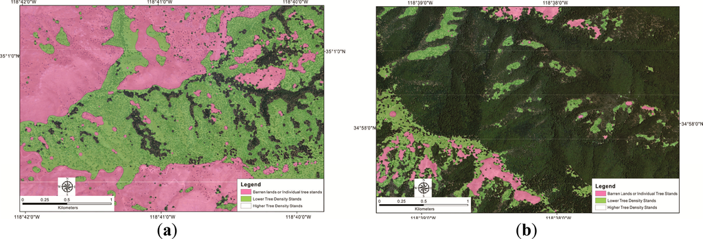 The two image segmentation optimized for delineation of tree density based on the random walker algorithm effectively separated the two species association. Ponderosa pines and California black oaks tended to occur in dense tree stands, while grey pines and blue oaks tended to occur in sparse tree stands within the study area. Agreement of species association with image segmentation optimized for delineation of tree density reached about 80% overall accuracies and 0.6 kappa values. In particular, using the aspect stratification for the thresholds of desired objects (firstly, for barren lands or individual tree stands and secondly for lower tree density stands) by natural break optimizing for the random walker algorithm did perform the best to produce image segmentation optimized for delineation of tree density (Table 1). Visually, step one and step two were effective to separate tree density patterns into three tree density categories, barren lands or individual trees, lower tree density stands and higher tree density stands, and the two selected regions of two tree densities had similar performances on separations of tree densities (Figure 8).