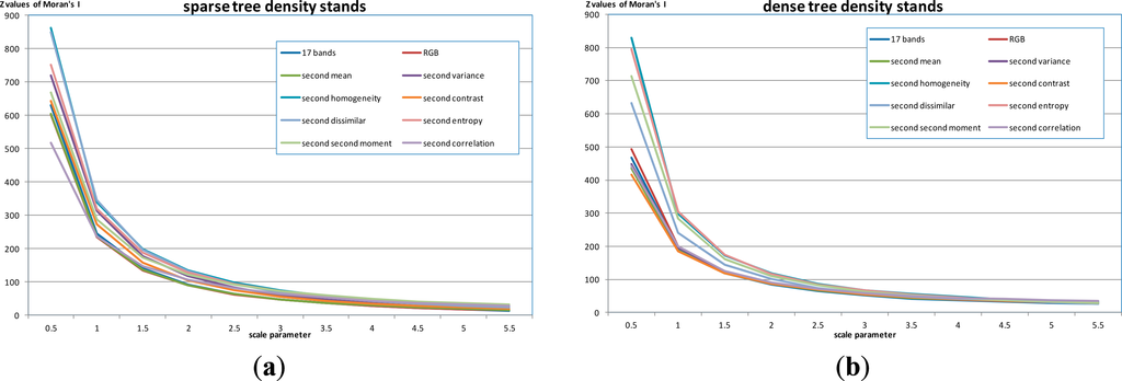The implications of species segmentation were to test the applications of the vegetation hierarchical framework, and whether the results related to specific guidelines of algorithm or parameter selections. The results employed an unsupervised evaluation (the Z values of Moran’s I under 999 permutations to evaluate whether the attributes of segmentations (average within segmentation) were significantly different from the neighbor segmentation. Although all showing decreases of the Z values of Moran’s I with increases of the scale parameters using different attribute combinations for segmentation (Figure 9), and image objects in two test areas both violated the object assumption with equal internal variances [20], the two tree density patterns did have fairly different reactions in most of attribute combinations on defining detailed species objects.