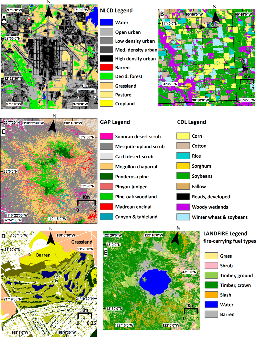 Landsat Thematic Mapper (TM) was launched in 1982, providing improved spatial resolution and re-configured spectral bands designed specifically to provide better discrimination of vegetation than its predecessor, Landsat MultiSpectral Scanner (MSS). Better discrimination of earth surface features was part of the motivation for re-designing the Landsat satellite, with three of the eight mission objectives being: (1) mapping agricultural land use; (2) surveying forest resources; and (3) land cover change detection [42]. MRLC is the first national-scale realization of these mission objectives. The CDL provides detailed data on crop types suitable for planning and management. In combination, NLCD, C-CAP, GAP, and LANDFIRE constitute a survey of many aspects of forest resources, including detailed depictions of forest types and composition, forest canopy height, forest canopy density, and many aspects of the fire characteristics of forests. The third Landsat TM mission objective [42] (land cover change detection) has experienced a renaissance in recent years as land change science has emerged as a new discipline due to growing concerns over environmental sustainability [43], and land cover monitoring is one of the objectives of the newly emerging area of research [44]. Prior to the emergence of MRLC, information on land cover change was rare, scattered throughout the internet and research community as local efforts using one or two Landsat images. Through NLCD, C-CAP, CDL, and LANDFIRE, land cover change data are now readily available to the user community. MRLC products have made the Landsat TM mission objective of land cover change detection [42] a reality.