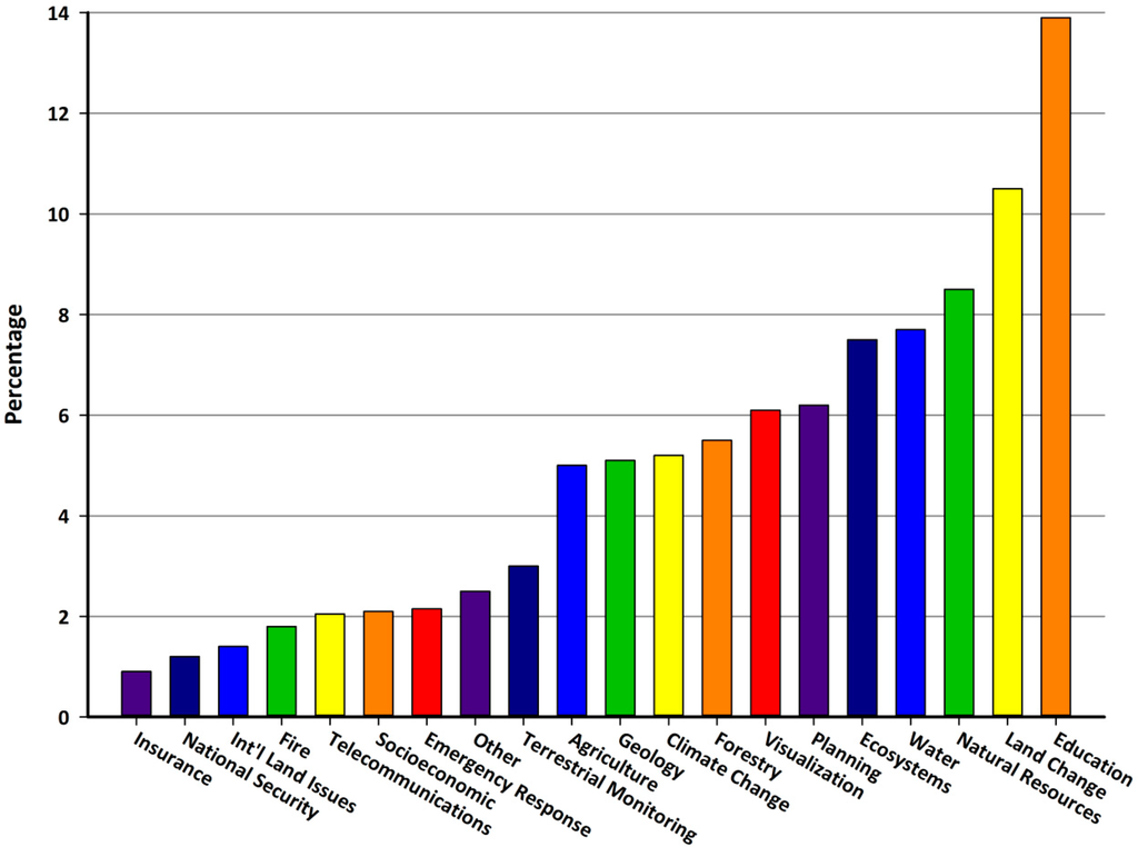 Product development research is a foundation for the widespread use of MRLC data. MRLC product development research includes image processing [4,5,50], classification [6,7], database design [8,26,28,51], change detection [16,27,52,53], modeling of forest canopy cover [54], and accuracy assessment [55–58]. This research is needed to support the continued refinement and increased efficiency in producing MRLC products for the nation. It is the seamless and consistent data at regional and national scales that, in part, fosters a broad user community. MRLC data have been used widely for environmental assessments, such as water quality degradation, deforestation, fire, biodiversity, and overall landscape condition. Less well known are uses of MRLC data for understanding aspects of human health and well-being. Diversity of MRLC land cover has been used to map spatial patterns of crime, with the authors noting the novelty and potential importance of such data for uncovering the spatial patterns [59]. MRLC land cover was used as a measure of green space to map vulnerability to heat stress for major cities of the USA [60], and, in a process-based study, MRLC land cover was used to show that preservation of large wetlands and their attendant bird communities may be a useful approach for controlling outbreaks of West Nile Virus [61].