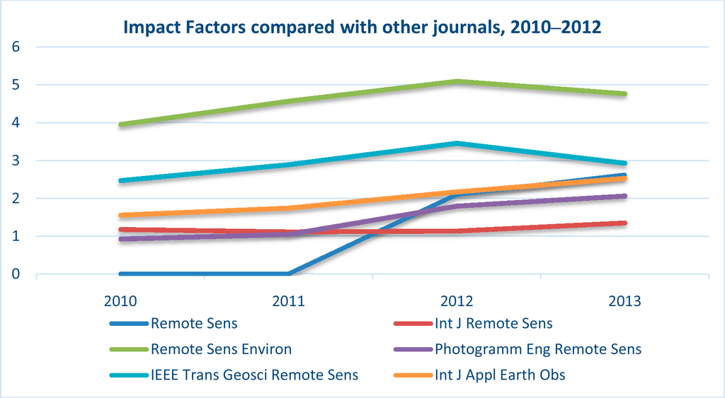 Having started in March 2009, Remote Sensing currently has an impact factor of 2.623 (Rank 6 out of 27 international journals published in Remote Sensing, GIS, and Spatial Science). A comparison with some of best remote sensing journals (Figure 1) shows the rapid gains made by Remote Sensing. In 2013, we received 650 articles for peer-review, of which we accepted 280 (43%), rejecting the rest 57% (Table 1). From 24 papers published in January 2013, the number increased to 39 in December 2013. There has been a further, highly significant increase in these numbers in 2014. For example, 216 papers were under consideration for publication in just two recent months, April and May, of which we accepted and published 45 in April and 52 in May, a total of 97 (45%). The 216 papers were submitted at various points over previous months and were in for decision during the two months mentioned. What this means is that, in the future, we can expect over 100 papers awaiting decisions every month. Handling and maintaining quality peer-review and publication is a major task that requires coordination, cooperation, enthusiasm, and a sense of service amongst the publication staff. I want to give readers an overview of how we handle this process. First, Remote Sensing has two editorial offices: one in Basel, Switzerland and another in Beijing, China. Once the authors submit the manuscript online, the editorial office processes the papers and: (a) sends them to peer-review; or (b) returns them to the author without review (when the quality is poor). For those manuscripts selected for peer-review, three to six reviewers are typically found for every manuscript. Second, once the reviews are all submitted, the manuscripts and the reviews are sent to one of the Associate Editors (AEs) or Guest Editors (GEs) in the case of guest edited issues. The AEs and GEs look at the reviews and send the paper back to the editorial office with a decision: (i) revise, (ii) reject, (iii) accept. It is quite normal to ask for papers to be revised at this stage. The revision iteration from editorial office to AEs/GEs and back is, often, more than once (I have not seen a single paper come to me without being revised; and often it is revised multiple times). Third, when AEs/GEs make a final decision, all manuscripts await the Editor-in-Chief’s (EiC; myself) final decision. At this stage, the EiC considers the reviews as well as comments from AEs/GEs and again makes one of the decisions: (i) revise, (ii) reject, (iii) accept. My role is to ensure that certain standards are maintained and that we apply them uniformly across all manuscripts. Accepted papers will then be edited and processed by the MDPI editorial office headquarters in Basel, Switzerland. Therefore, every manuscript goes through five levels of scrutiny before a final decision is made. These five levels, to re-iterate, are: