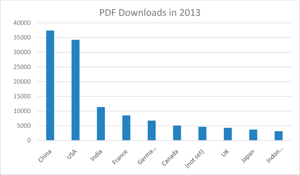 A good way to gauge the interest and importance of an online journal is to look at its online statistics of readership. In this regard, the total number of visits through Google to Remote Sensing manuscripts in 2013 was 175,157 (* “Visits” represent the number of visits to the journal homepage through Google.). The total number of pageviews is 490,669 while full text downloads from MDPI website was 417,372 in 2013, see Table 2. Figure 2 shows the geographical distribution of PDF downloads in 2013.
