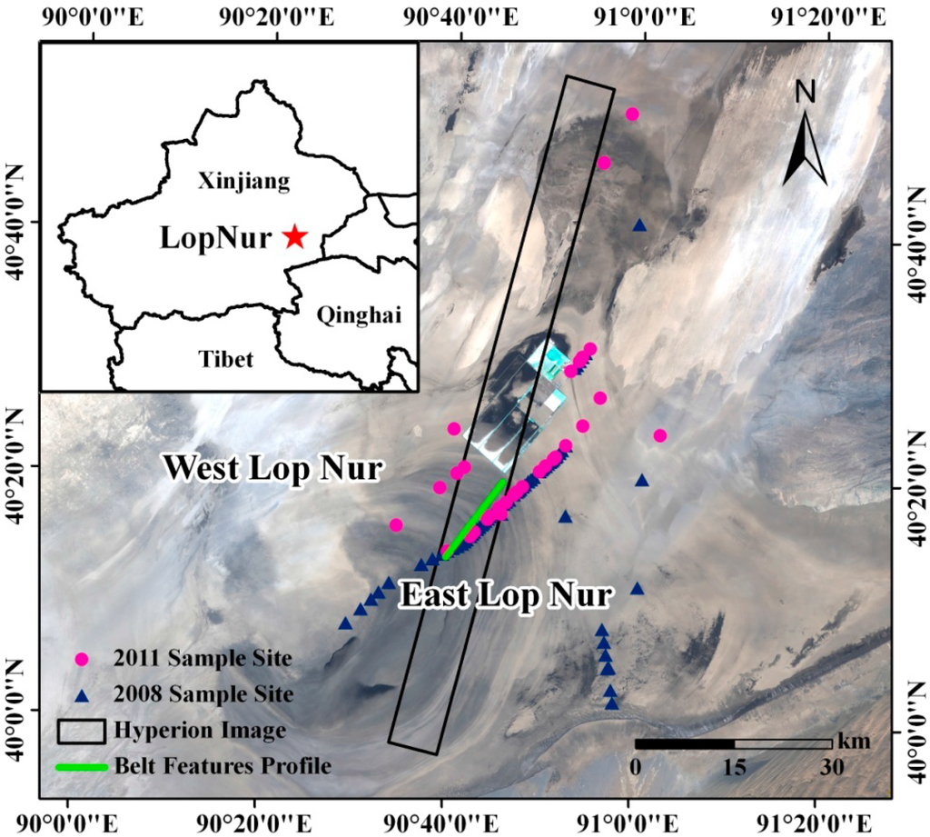 One Hyperion image covering part of the study region was acquired on 8 January 2007 with cloud-free. Due to of the difficulty of acquiring satellite hyperspectral data, and especially the weather conditions which are not favorable for conducting field work in Lop Nur in an “ideal” timeline, sampling could not be conducted simultaneously with image data collection. This Hyperion image was the most optimal data for this work, though it did not cover all 2008 and 2011 sampling sites.