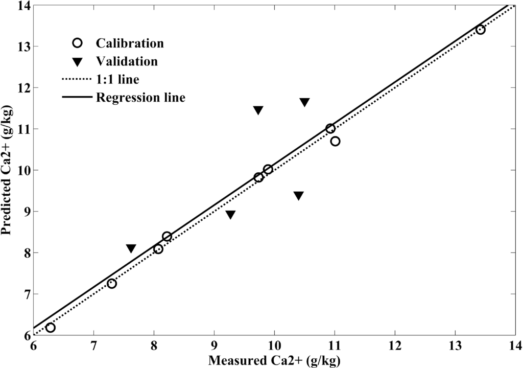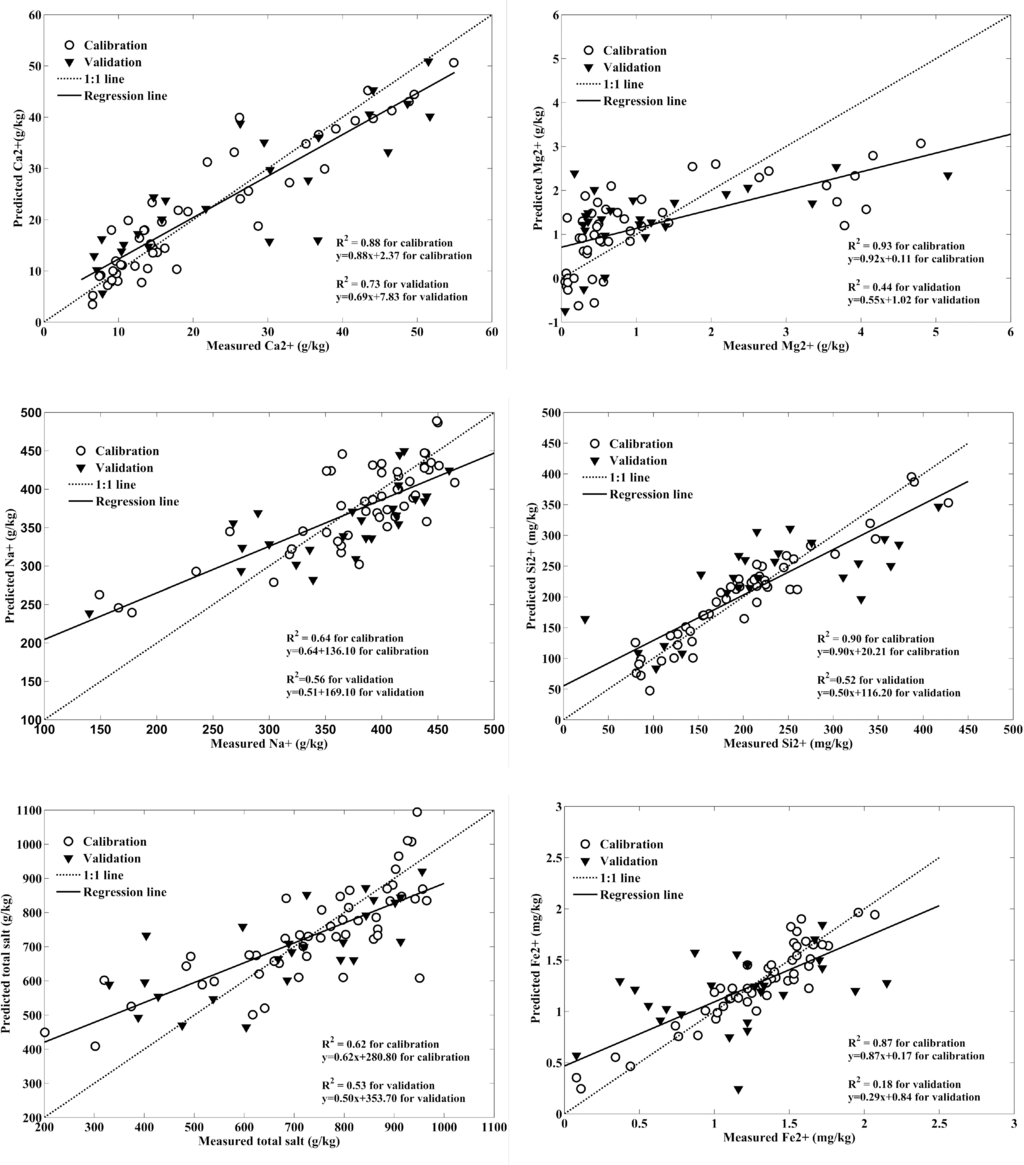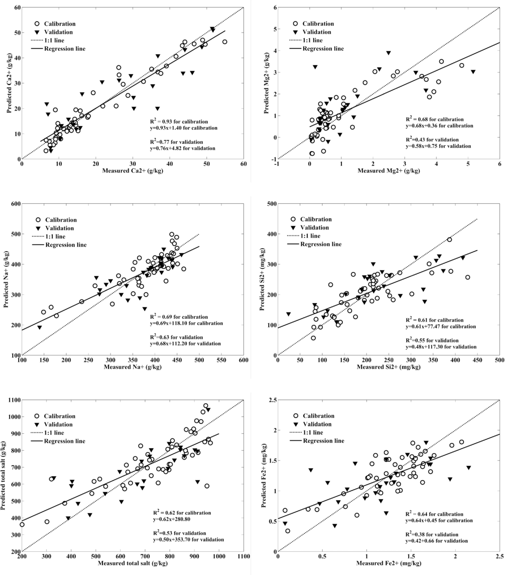 In general, the validation results indicated that PLS can satisfactorily predict most of salt-crust properties from hyperspectral data. All RPD values for PLS validation were less than 2 except for Ca2+ with simulated Hyperion spectra, implying that almost no soil properties can be predicted using hyperspectral data with good accuracy. The PLS models with the laboratory spectra (897 bands) and the simulated Hyperion spectra produced satisfactory validation for total salt, Na+ and Si2+. PLS gave the poorest prediction for Mg2+ using the laboratory data and simulated Hyperion data. The result is not consistent with the results reported by Shepherd et al. [41]. The reason maybe attributed to the Mg2+ range of the validation samples. The calibration dataset and validation dataset both were selected randomly. The Mg2+ range for the calibration dataset is 0.049–4.80 g/kg, while the Mg2+ range for the validation dataset is 0.048–5.60 g/kg. The Mg2+ range for validation is beyond the range for calibration.