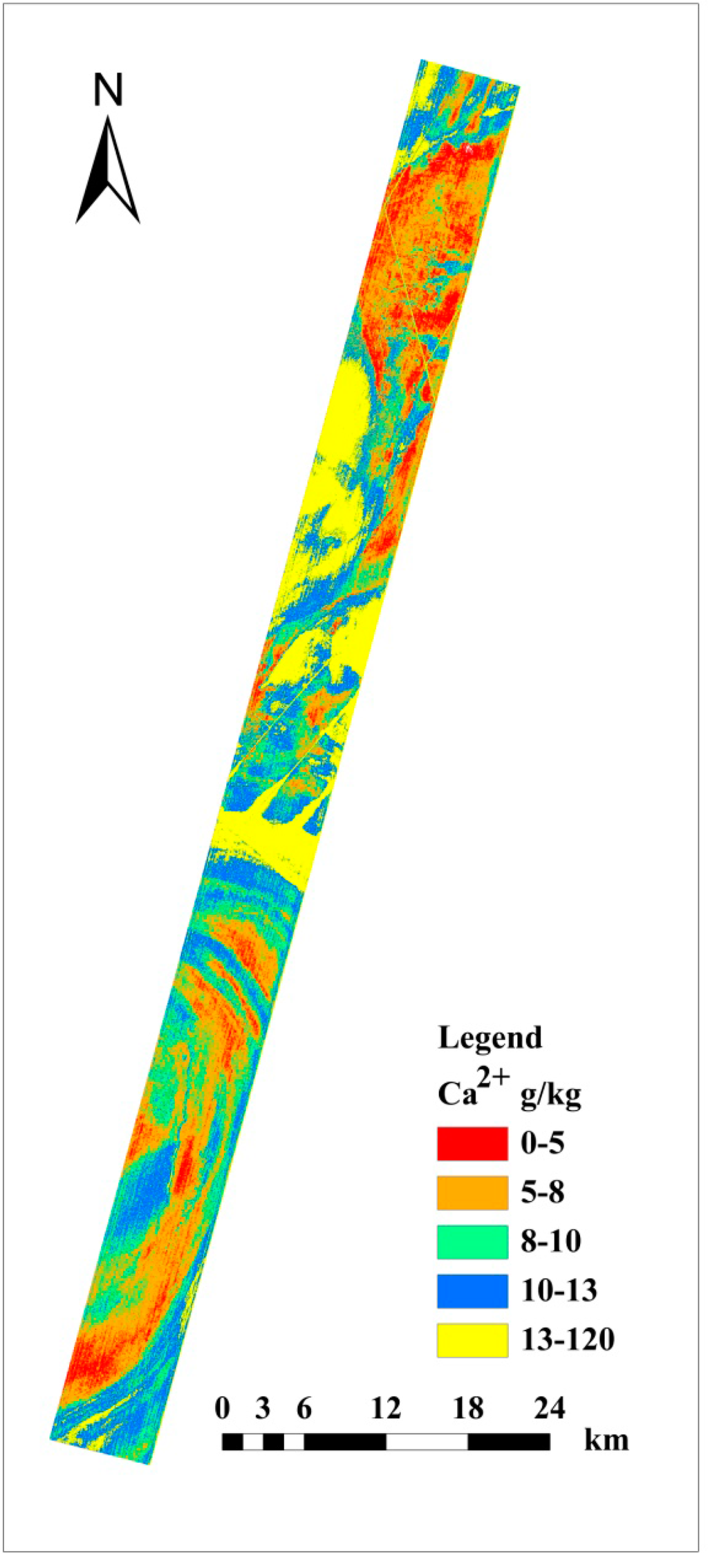 The PLS model with 13 salt-crust samples was applied to the Hyperion images to generate a spatial distribution map of Ca for the Lop Nur “ear” area. The Ca2+ distribution for “ear” area on the map is dominated by an orange color with 5%–8% Ca2+ (Figure 5). The blue belt represents 10%–13% Ca2+ as seen on the map.