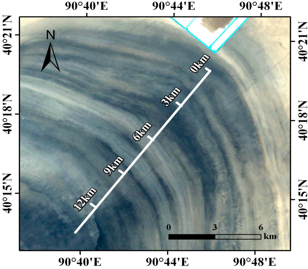 The salt crust of a playa lake is a complex landscape, which records the drying process of an arid land surface and the continuous evolution of natural water. The type and abundance of salt-crust properties in a playa lake contain substantial paleoclimatic records and indicate the whole process of environmental evolution because climatic conditions were recorded in the lacustrine sediments as geochemical signatures. Lop Nur, located on the eastern margin of Tarim Basin in northwestern China, was located at the convergence of the Tarim River, Kongqi River, Cheerchen River, and others. Lop Nur once consisted of thousands of square kilometers of water and gave birth to thousands of years of the ancient Lou-lan civilization. Due to the influence of modern human activities, rivers were diverted, and the water supply continued to decline. Lop Nur Lake dried up before 1972 according to Landsat MSS images and early field reconnaissance carried out by Chinese scientists [1]. In the gradual drying process of Lop Nur, because of strong evaporation, freezing, and thawing, salt crystallization occurred to form a salt crust 30–100 cm in depth in different land types. Lop Nur became famous around the world for its eastern part, which appears as “the big ear in the western part of China” in Landsat MSS images. The “Ear” feature of the salt crust appears in remote-sensing images as light rings alternating with dark rings in a roughly circular distribution.