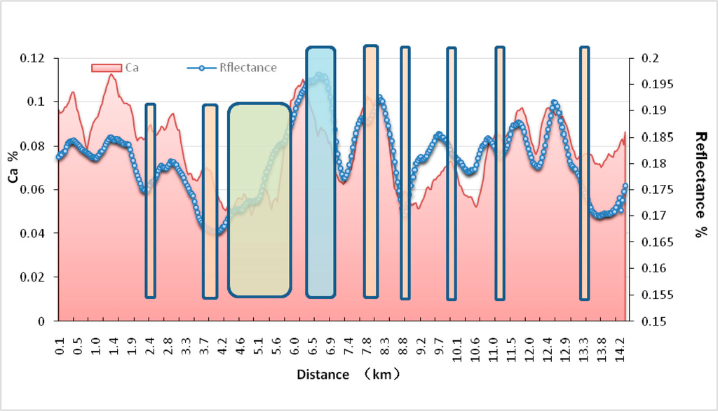 Moreover, some anti-correlated areas shown in Figure 7 can be used to explain the environmental background of the belt features. At two anti-correlated areas at 2.4 and 3.7 km, Ca2+ content reaches peak values, and the corresponding reflectance values are in valley. Large values of Ca2+ deposition readings show that the climate was arid, whereas the low reflectance indicated that temporary larger upstream runoff events, carrying large quantities of sediments, may occur. These two anti-correlated areas should belong to the same climatic period because of their close location, when some extreme weather events perhaps occurred to cause unstable upland water flow. From 4.2 to 5.6 km, Ca2+ content shows a consistent trend with variation in reflectance, but the stability is poor, indicating that this period could represent the unstable transition period during a drought. From 6.5 to 6.9 km, Ca2+ content decreases, and reflectance increases; with less upland water flow, the salt concentration of the lake was probably so high that Ca2+ precipitation gradually weakened and then Na and K as high-solubility salts began to precipitate and deposit. This period could have been one of extreme droughts. At the anti-correlated areas at 7.9, 8.9, 10.0, 11.1, and 13.4 km, Ca2+ content has negative correlation with reflectance, indicating that there could have been a small-scale temporary runoff event under an arid environmental background, leading to a temporary increase in sediment and making the reflectance of these areas low.