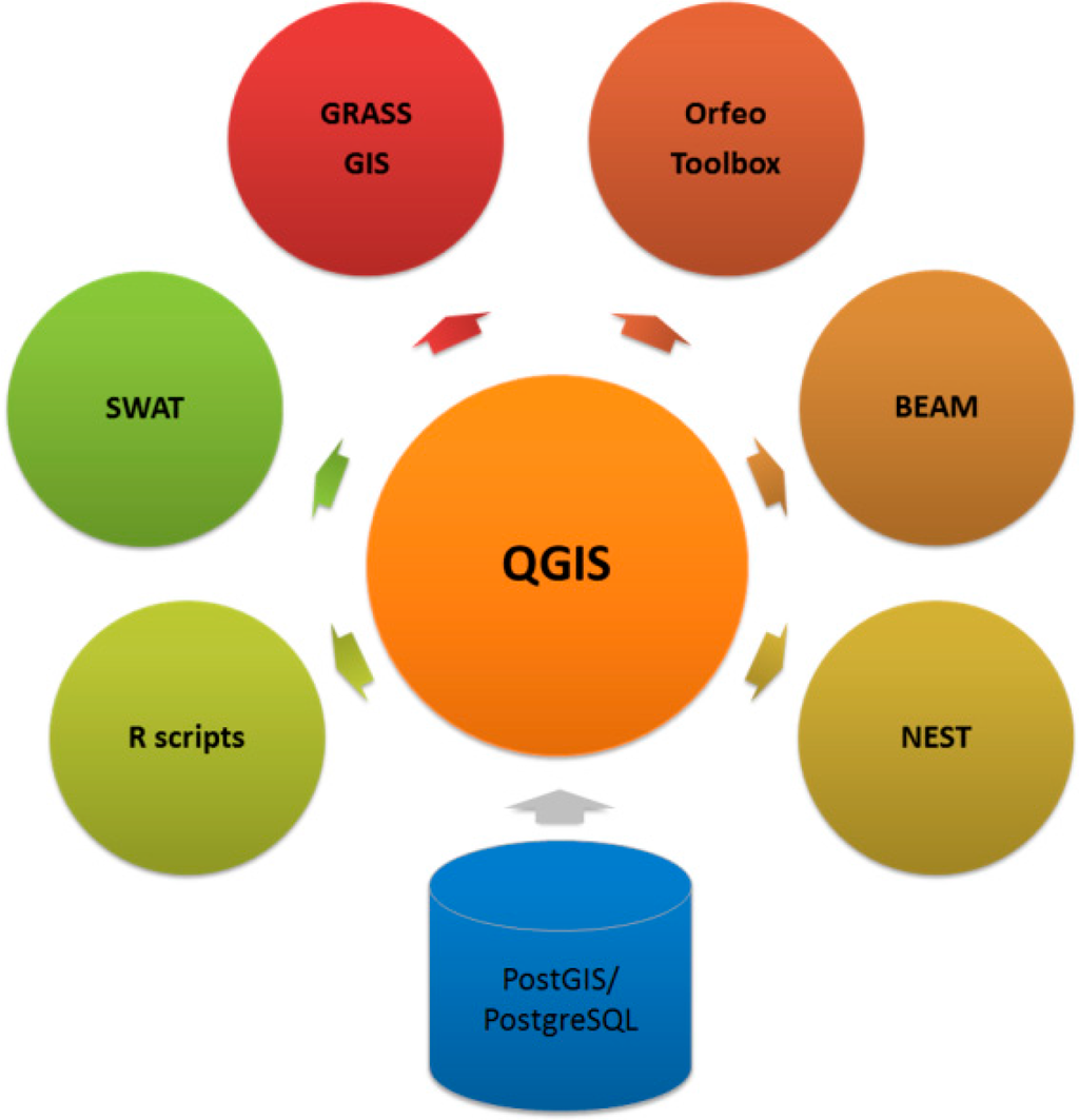 QGIS was chosen as the central integrating platform, due to its clear and accessible GUI, strong development community, ease of implementing additional functionalities through Python plugins and its high level of interoperability with major GIS data formats through the use of the Geospatial Data Abstraction Library (GDAL/OGR) library [14]. Moreover, the integrated Processing toolbox, formerly known as SEXTANTE [15], brings the ability to easily incorporate geoprocessing algorithms from various applications into QGIS. It acts as a joint repository for a wide range of algorithms, some native to QGIS and others imported from external applications, such as GRASS or the Orfeo Toolbox. It also allows for easy incorporation of R and Python scripts. The algorithms included in the Processing toolbox integrate seamlessly with the QGIS capabilities of data I/O, rendering or map creation.