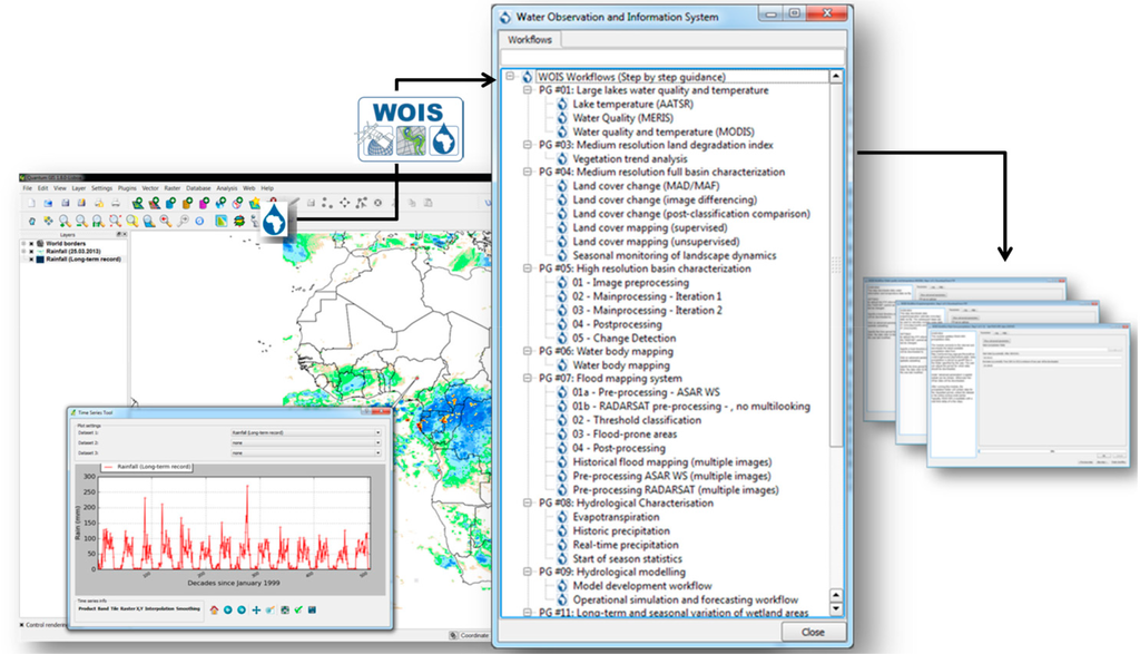 In addition, Python scripts [13] were used for automating certain tasks and integrating the different software. WOIS combines full versions of the component software into a multipurpose system consisting of a storage container for the geodata, extraction and processing of the EO data through customized processing facilities and integrative tools and models aimed at decision support, e.g., hydrological modeling and GIS-embedded visualization and analysis tools.