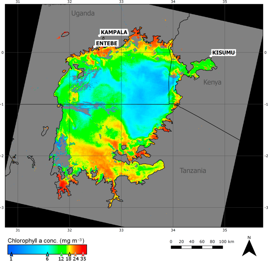 The provision of clean fresh water is a serious environmental challenge, and optical remote sensing has become an increasingly important tool for monitoring water quality on a regular basis. Therefore, WOIS provides workflows for estimating operational and historical, satellite-derived, water quality monitoring products for major lakes in Africa (Figure 3). The products can be used for, e.g., potential identification of point sources of pollution, the establishment of possible correlations with regular cholera outbreaks, better understanding of eutrophication processes and regular reporting obligations.