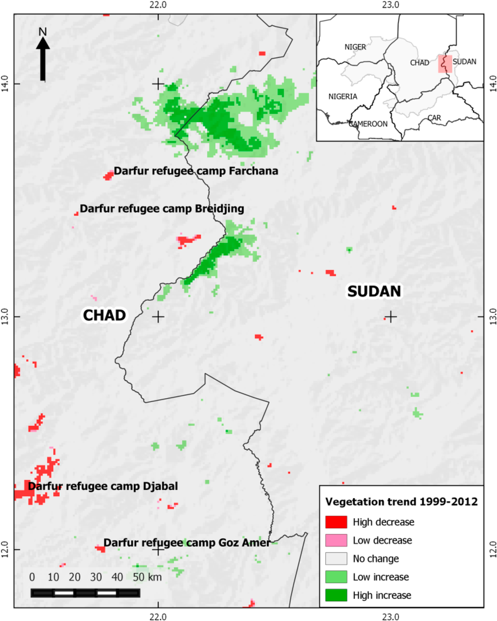 Basin-wide land degradation mapping can also be performed using a WOIS-embedded workflow. The WOIS implementation of the mapping method for land degradation uses mostly GRASS modules, with additional Python scripts to facilitate the processing of time-series data according to principles put forward in Huber et al. (2011) [25] and Hellden and Tottrup (2008) [26]. The workflow ingests gap-filled time series of NDVI (as a proxy for vegetation biomass [27]) and rainfall estimates in order to analyze vegetation/rainfall correlations and to control NDVI trends for variability in rainfall. NDVI residual time series, originating from regressing NDVI on rainfall, is subsequently searched for significant long-term trends in vegetation productivity, which is not related to rainfall, but possibly contributable to humans (e.g., population growth, changing land use practices, deforestation, infrastructure developments, as well as rural exodus and urbanization). Full basin assessments of land cover and land use changes, as well as land degradation processes have been successfully demonstrated for Lake Chad and Volta Basin using medium resolution imagery from MODIS and SPOT VGT. When evaluated against higher resolution imagery (e.g., Landsat and Google Earth), the overall accuracy of the land cover/land use products was assessed to be around 80%, with a kappa coefficient of agreement exceeding 0.7. High resolution imagery also supported the validation of the land degradation analysis, yet the causes behind the observed vegetation trends are often manifold, and hence, local experts were consulted to verify and give reasons for distinctive negative or positive vegetation trends. The local experts were able to explain most of the negative vegetation trends with urbanization, dam constructions and deforestation, while positive vegetation trends were mostly associated with protected areas and irrigated lands. A particular interesting trend pattern was observed along the border area of Chad and Sudan. Here, large areas with strong positive vegetation trends appear on the Sudanese side, while pockets of negative vegetation trends are spotted on the Chad side. The reasoning behind this pattern is explained by population displacement as a consequence of the conflict in Darfur (Figure 5) and as corroborated by other studies [18].