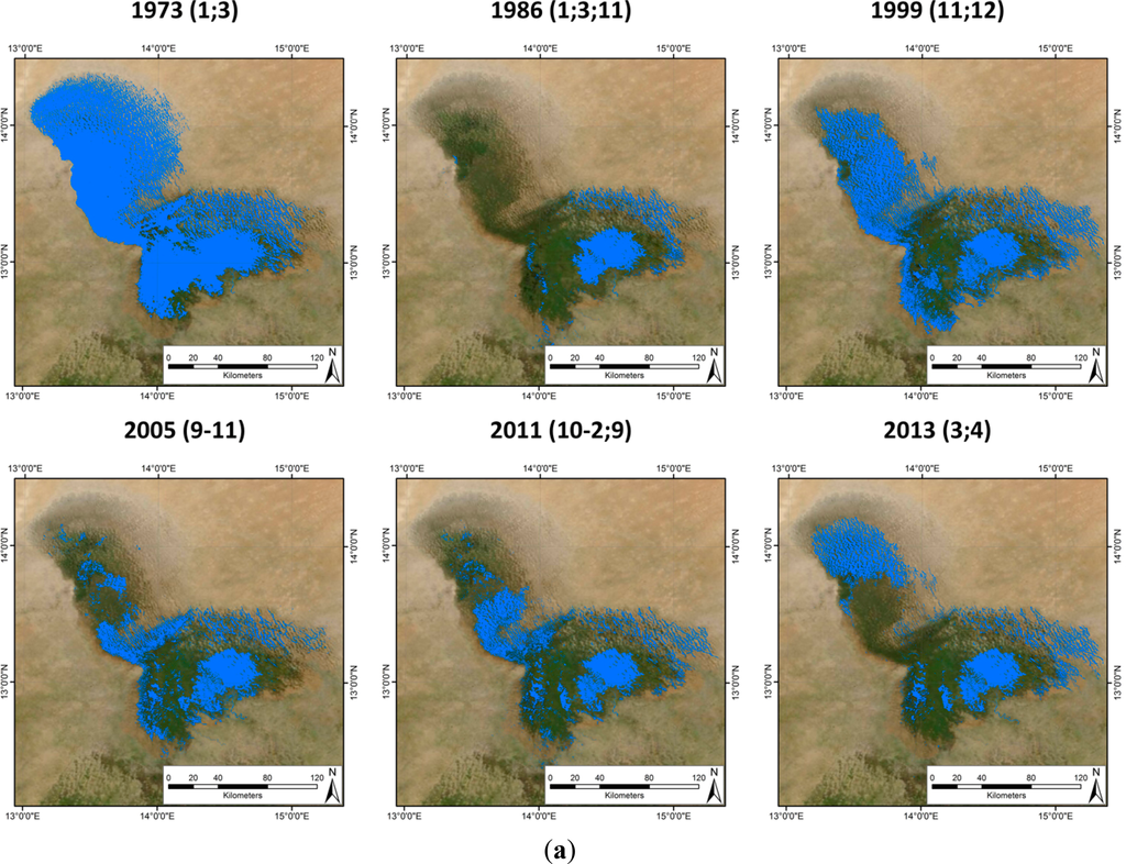 The WOIS high resolution land and water mapping tools were so far successfully implemented for seasonal small water body mapping in the Volta Basin and for mapping water demand-related land cover changes in sub-basins of South Africa. They are currently being implemented for, among others, flood vulnerability mapping in Namibia, as well as for dam monitoring in sub-basins of Zambia. The system components have further been employed by the Lake Chad Basin Commission for assessing in detail the historic changes of the Lake Chad area extent (Figure 6) and its surrounding basin land cover changes, documented in the first Lake Chad Biannual Environmental Report. The historic water area extent has been estimated for a number of selected years (Figure 6a) from the maximum water extent derived from a composite of high resolution images for each year, taken predominantly during the dry season (Figure 6b). It has been shown that despite the significant decrease of Lake Chad in the 1980s, the area of water bodies has nearly doubled from 1986 to 2011, resulting in a significant change in vegetation cover and land use in the basin originally occupied by the lake. The results are directly employed to control and evaluate water management regulations in the basin.