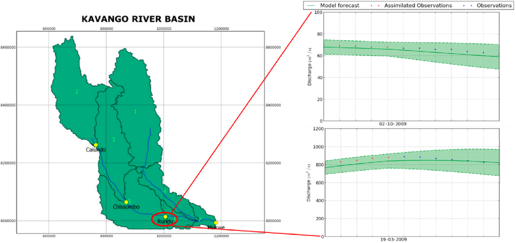 In the context of real-time operational water resources management, data assimilation (DA) has become the state-of-the-art technique to merge model predictions with the latest available data from a variety of sensors, including in situ and satellite-borne instruments. Assimilation of in situ data has become standard practice in most operational flood forecasting models (e.g., [31]). Many operational hydrological forecasting systems use variants of the Kalman filter [32] for data assimilation. In particular, the extended Kalman filter (EKF, [33]) and the ensemble Kalman filter (EnKF, [34]) are widely used in hydrological applications, since they are suitable for non-linear problems.