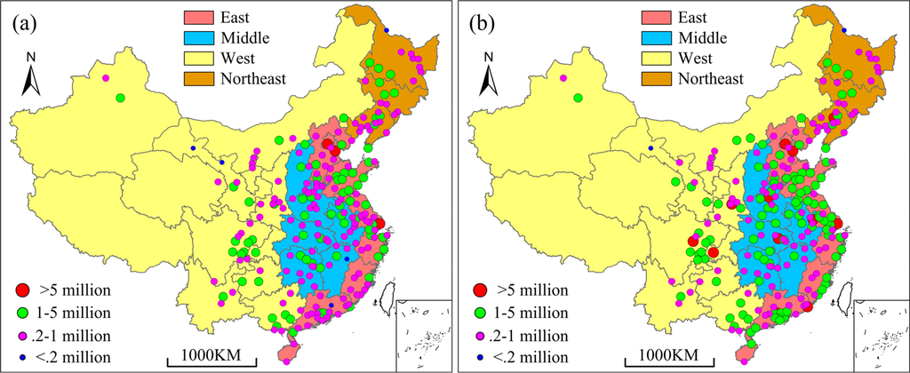 China has been experiencing unprecedented urbanization over the last several decades [13,30]. The rapid economic growth of China is not only associated with the large-scale migration of people into cities [6], but is also connected with many environmental and social consequences, such as urban heat islands (UHI) [30], increased health exposure risks [31] and enhanced regional disparities of cities [12]. Investigating the spatial and temporal imbalances between cities is crucial for the sustainable development of China in the context of policy making. The combination of socioeconomic data and DMSP/OLS nighttime light data provided a substantive approach to estimating the spatial and temporal differentiations between China’s cities.