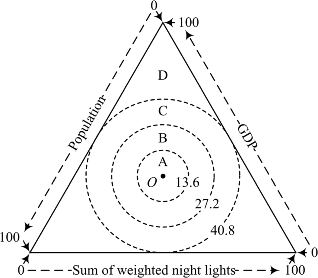 In Equation (2), RPOP, RGDP and RNTL represent population ranks, GDP ranks and the sum of weighted night lights ranks, respectively, of the 226 cities in a particular year; VPOP, VGDP and VNTL represent the normalized values of the three variables, the combinations of which were used as coordinate values to plot the ternary diagrams, as shown in Figure 3. Each point on the ternary diagram represents an urbanization status for a city in a particular year. Theoretically, if a city was in a balanced urbanization process in a certain period, the ranks of its three parameters should be close or approximately equal; therefore, the point drawn on the ternary plot should be very close to the center point O. Conversely, points away from O on the triangle graph represent cities with an imbalanced development status. As shown in Figure 3, the three equally spaced concentric circles divide the ternary plot into four sections, which represent four urbanization statuses according to distance from point O: A represents the most balanced, B is less balanced, C represents the imbalanced urbanization status and D is the most imbalanced. The ternary distance between a city point on the ternary plot and point O can be calculated according to Equation (3).