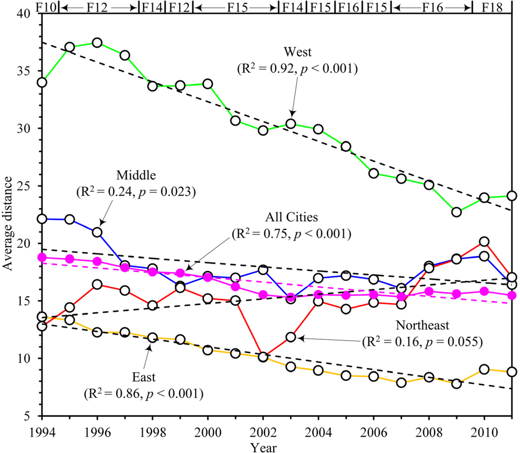 In this study, the 226 cities were divided into four regional groups: the east (including Beijing, Tianjin, Shanghai and cities in Hebei, Shandong, Jiangsu, Zhejiang, Fujian, Guangdong and Hainan provinces), the middle (including cities in Shanxi, Henan, Anhui, Hubei, Hunan and Jiangxi provinces), the west (including Chongqing and cities in Xinjiang, Qinghai, Gansu, Inner Mongolia, Ningxia, Shaanxi, Sichuan, Yunnan, Guangxi and Guizhou provinces) and the northeast (including Heilongjiang, Jilin and Liaoning provinces). We calculated the annual average regional Euclidean distances of cities in the four regions from 1994 to 2011 using the ternary plot method, as illustrated by Equation (3) and Figure 3. To investigate the variation trends of the average distances, we estimated regression parameters of a linear model using the least squares method. In this method, the “x” parameter is year and the “y” parameter is the average distance values of each year. The analyses and variation trend fitting results are illustrated in Figure 4.