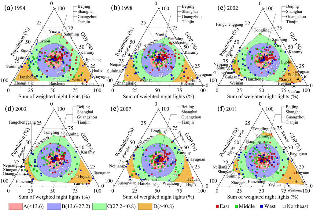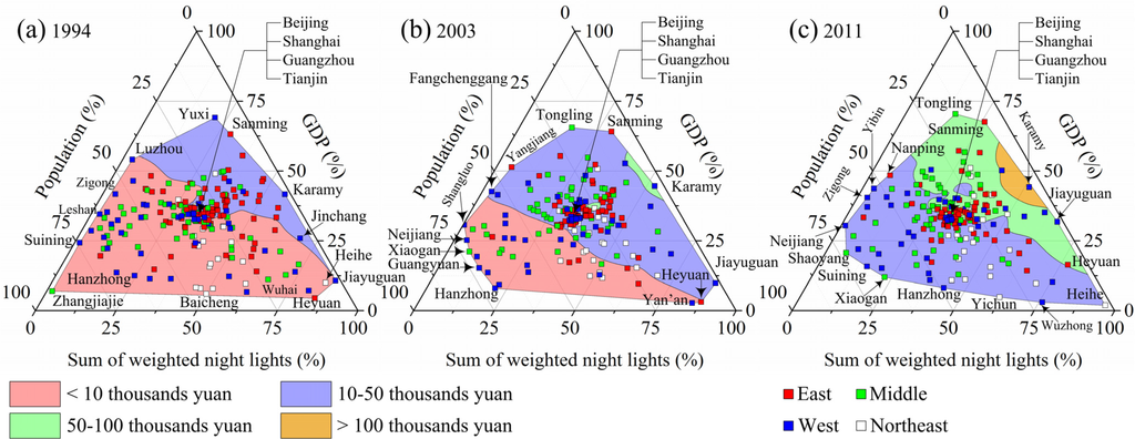 City development is accompanied by many social phenomena, such as population dynamism, economic growth and the construction of infrastructure, all of which complicate the estimation of urbanization processes. It is well documented that China has been experiencing rapid urbanization since the 1990s with extensive rural-urban migrations and vigorous economic growth. Public policies, location and natural resources are potential factors leading to differentiation in the urbanization processes of China’s cities, especially in different regions (as shown in Figure 2). Differences between cities can be represented as disparities or imbalances of socioeconomic and nighttime light variables. For example, cities playing the role of economic center may attract many people and exhibit correspondingly higher ranks in terms of GDP sum of nighttime lights. However, cities that produce certain natural resources, such as coal, oil or gas, may have high economic ranks but low ranks in terms of population and nighttime lights. The disparities between the three parameters of a city—population, GDP and the sum of nighttime lights—indicate an imbalanced urbanization process, which can be represented on the ternary diagrams using the distance factor.