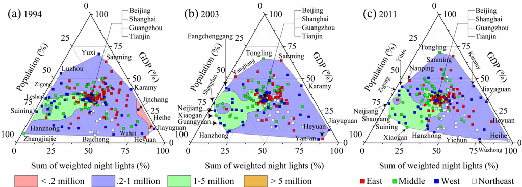 Socioeconomic parameters, such as population and GDP, are the most frequently used indicators to estimate urbanization. As shown in Figure 6, our results indicate that the number of cities with small populations (<0.2 million) declined from 1994 to 2011. With rapid development, regions defined by population contours of 1–5 million also expanded to some extent. Most provincial-level cities, such as Beijing, Shanghai and Guangzhou, are concentrated around the center of the triangle. Cities where population played a dominant role in the ternary indicator system are located in the left-bottom area of the triangles. Such cities usually maintain relatively lower income and infrastructure construction levels. Additionally, cities with relatively high ratios of population or night lights, such as Zhangjiajie in 1994 and Heihe in 2011, could experience extreme distributions on ternary plots; however, GDP would not lead to similar distributions. Therefore, our results revealed that it is difficult for a developing city in China to maintain a relatively small population and low level of total weighted nighttime lights alongside a relatively high level of economic advancements.