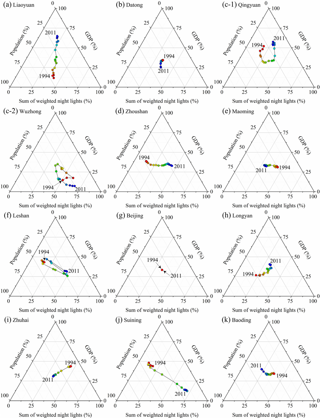 Type d and Type e patterns demonstrated horizontal left-to-right or right-to-left linear trajectories, as shown in Figure 8d/e (2.65%/5.75%), indicating that cities such as Zhoushan and Maoming were urbanized with relatively rapid population dynamics and strong intensity of human activities (e.g., infrastructure constructions), but steady economic advancements during 1994–2011. Approximately 8.85% of China’s cities, such as Leshan (Type f, Figure 8f), exhibited conspicuously repeated and complicated temporal trajectories on the ternary plots, indicating possible diapauses during the course of urbanization. Approximately 35.40% of the samples maintained extraordinary balance states among the three variables in the past two decades, as evidenced by the concentration of annual points around with the center on the triangle plots (Type g, Figure 8g). The Type h pattern was displayed by 1.33% of the cities and is characterized by a left-bottom to right-top linear trajectory, which means that cities, such as Longyan (Figure 8h), experienced relatively rapid changes in nighttime lights, but lower rates of population change. Similarly, cities exhibited linear patterns characterized by a right-top to left-bottom trajectory (Type i, like Zhuhai in Figure 8i, 10.18% of sample), left-top to right-bottom (Type j, like Suining in Figure 8j, 7.52% of sample) and right-bottom to left-top (Type k, like Baoding in Figure 8k, 2.65% of sample), indicating a series of homologous variation trends on the parameter combinations of population, GDP and the sum of weighted nighttime lights.