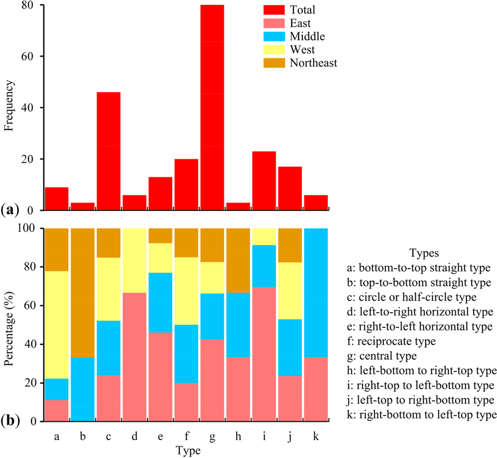 Third, the urbanization processes of the 226 Chinese cities could be classified into 11 categories by comparing the morphological characteristics of temporal ternary graphs of single cities. More than one third of the cities displayed balanced states (Type g, 35.40%) in their urbanization processes from 1994 to 2011. The rest of the cities demonstrated 10 different types of urbanization patterns. There were spatial differences between the four regions with regard to the urbanization process classifications. Most of the cities in the east (34 cities or 40.96%), middle (19 cities or 32.2%) and northeast (14 cities or 42.42%) regions showed a Type g pattern. Type c (15 cities or 29.41%) was the primary pattern in the west region.