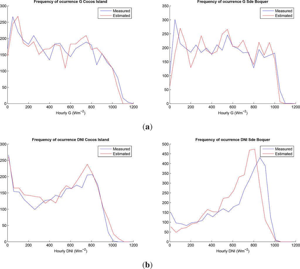 For the global irradiance, in general, the model does not provide the very low and high irradiance values measured at the stations. For intermediate irradiance levels, there is no clear pattern. For the two stations shown in Figure 2, the overestimation derived from the model for Sde Boqer (+8.41 Wm−2) is reflected in the graph where it is seen that the model has too many occurrences at high irradiance (800–900 Wm−2) and too few at low irradiance (<100 Wm−2). For Cocos Island there are no consistent differences in the intermediate irradiance range.