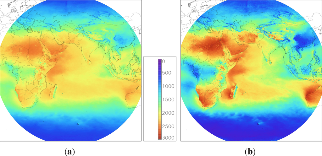 A number of solar radiation data sets have been retrieved using data from the Meteosat family of European geostationary satellites situated at 0° longitude. Examples include SOLEMI [4,9], the different versions of HelioClim [6,10], CM SAF [9,11], LSA SAF [12,13]. Some of these data are available free of charge, while others license the data on a commercial basis. The commercial/free status of the individual data sets may change with time. However, at the time of writing, to our knowledge there are no freely available high-resolution data for solar radiation retrieved from the eastern Meteosat satellites situated over the Indian Ocean (These satellites are officially named Meteosat Indian Ocean Data Coverage (IODC). We find this rather uninformative and will refer to the satellites as “Meteosat East”).