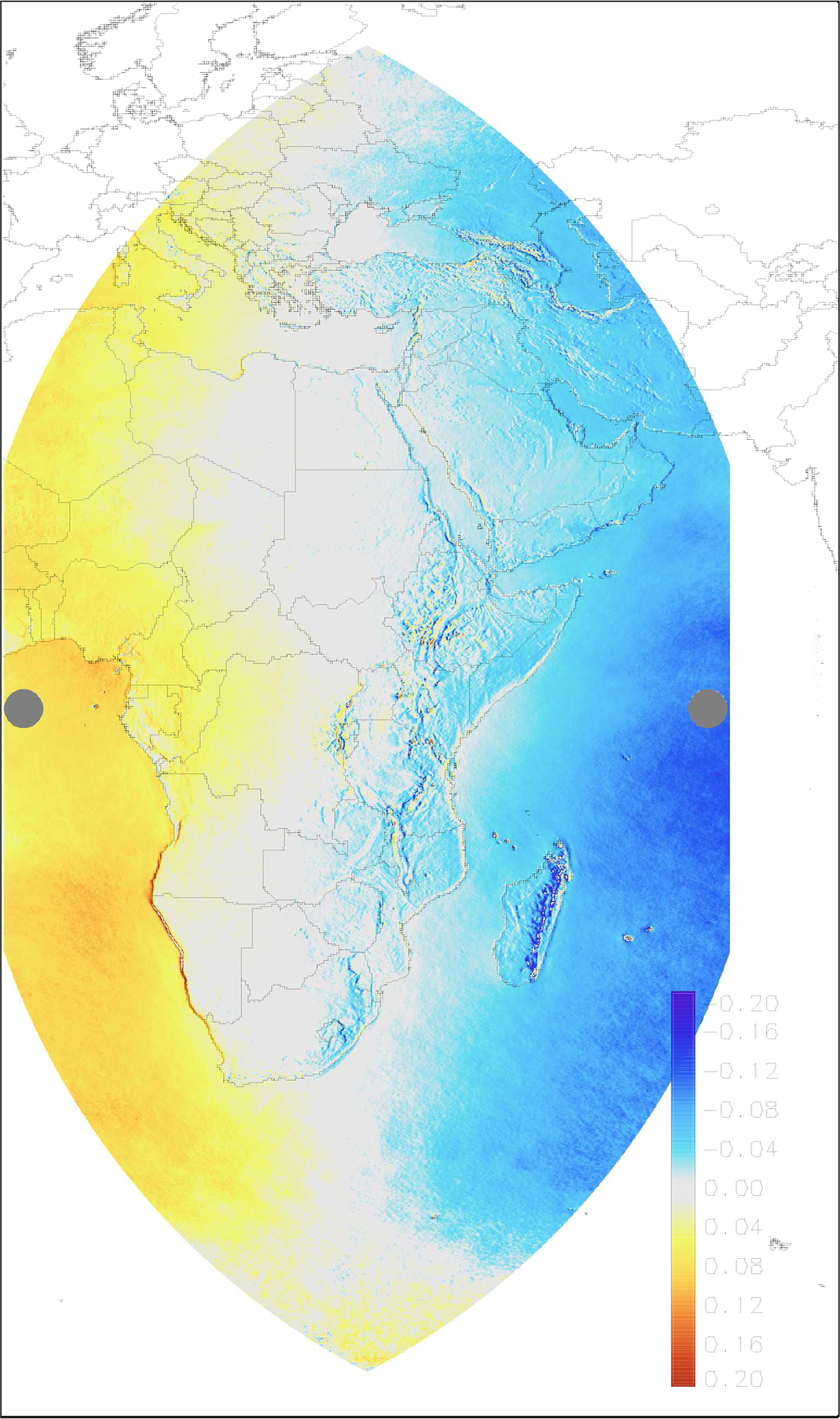 Figure 5 shows a map of the relative difference between H for the year 2005 calculated from the two satellites, defined as: