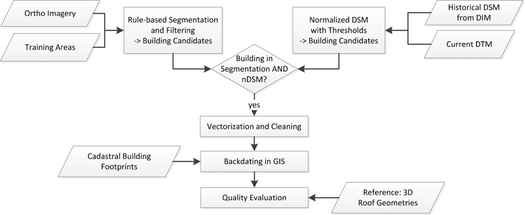 As a consequence, a back-dating approach based on today’s building database was incorporated into the building change detection process based on the historical DSMs from dense image matching discussed above and on the OBIA-based building detection process outlined below. Since the building detection process is conducted for each generation of imagery independently, it also results in a complete time series of detected buildings at each epoch.
