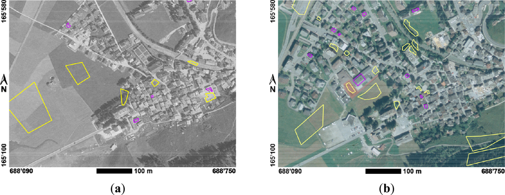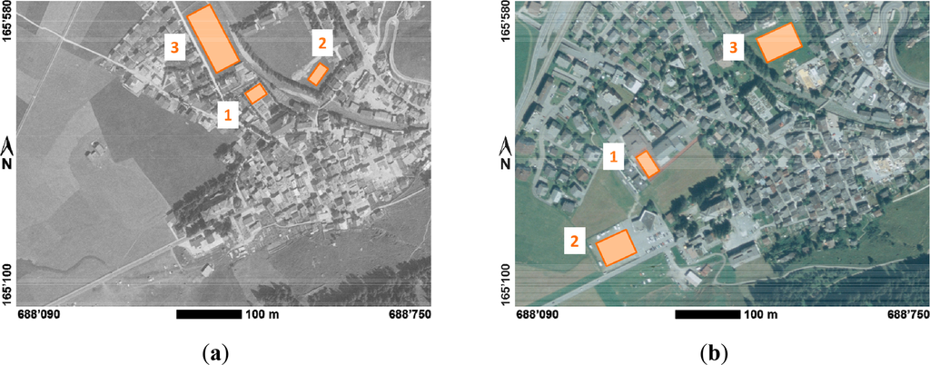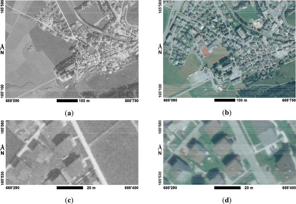 Historical aerial photographs have been used in numerous projects, but mostly as basis for manual digitization and visual human interpretation [2,3]. Digital processing of historical aerial photographs has successfully been applied to studies on large-scale areal phenomena such as vegetation dynamics [4,5]. However, there are no known studies reporting the successful use of historic grayscale aerial imagery for the automatic extraction of linear features or discrete objects such as buildings. However, changes in man-made structures, in particular buildings, are of interest when analyzing man-made impacts on the landscape, ecology, economy, and, for example, tourism [6]. The factors which thus far limited the use of historical aerial photographs for automated object and change detection include: the absence of multispectral or even color information, a limited radiometric resolution and a poor signal-to-noise ratio-compared to modern digital aerial or high-resolution satellite imagery.