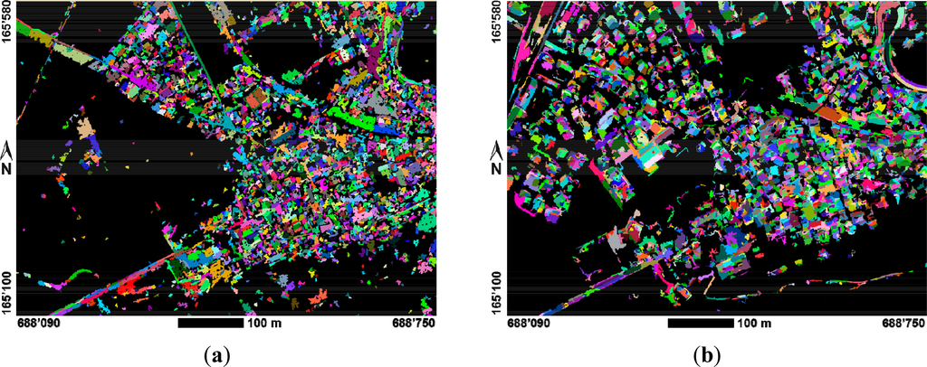 The selection of optimal segmentation parameters depends on the geometric and radiometric characteristics of the imagery and requires a certain amount of trial and error, as well as user experience. In our case a pixel per segment ratio of 500 in combination with high relative weights of 0.8 for the spectral and texture parameters and low weights of 0.2 for the parameters size and shape were used. The segmentation results obtained are shown in Figure 12a,b. The individual weights proved to be particularly valuable for separating trees from buildings. Their differentiation based on height (nDSM) only would otherwise be difficult, especially in greyscale imagery.
