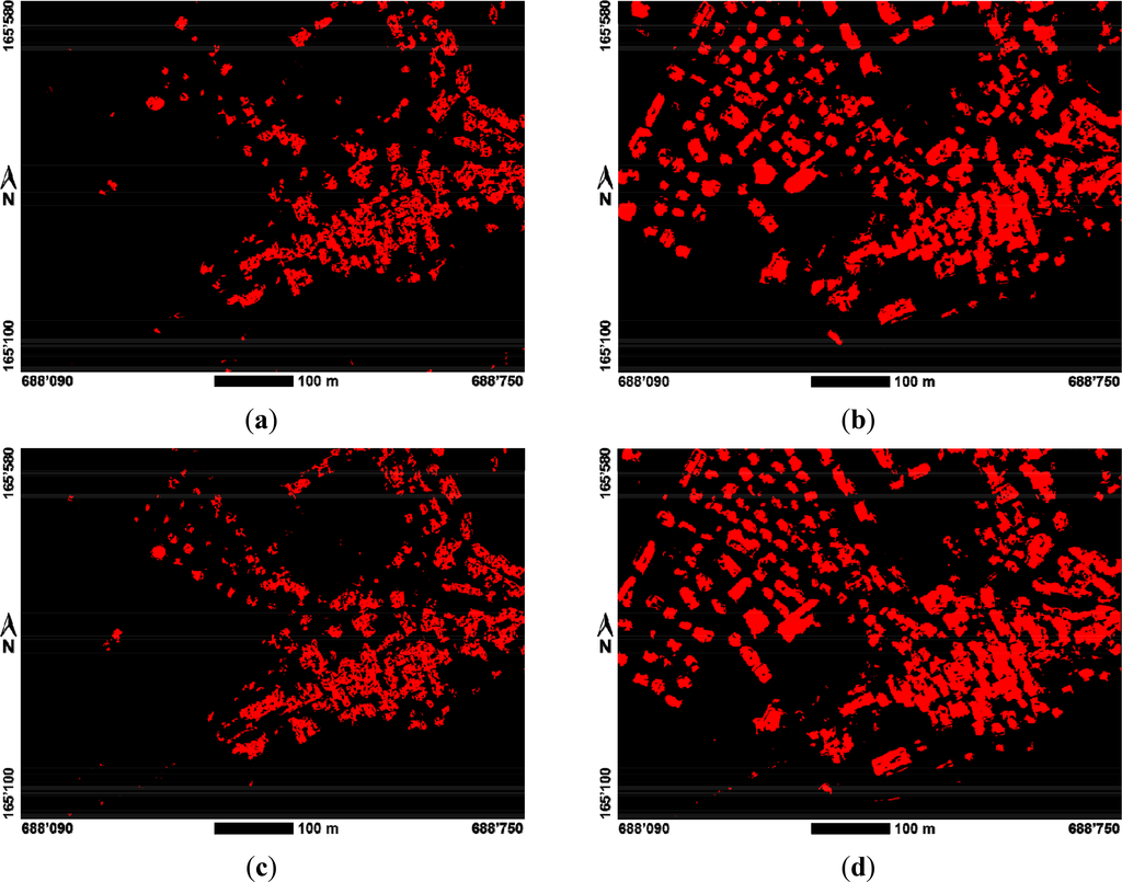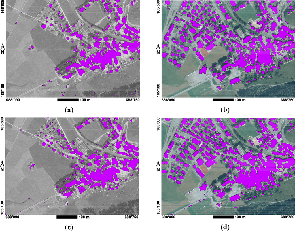 The results of the raw, pixel-based intersection results for the different nDSMs with the segmentation results for 1959 and 2007 are shown in Figure 13. The results for 1959 (left column, Figure 13a,c), being based on greyscale imagery, are clearly more fragmented than those for 2007 (right column, Figure 13b,d), which were derived from color photographs. The results based on densely matched DSMs (lower row, Figure 13c,d) yield a larger number of building candidate segments with contours that are generally better defined than in the results based on sparse DSM matching (upper row, Figure 13a,b).
