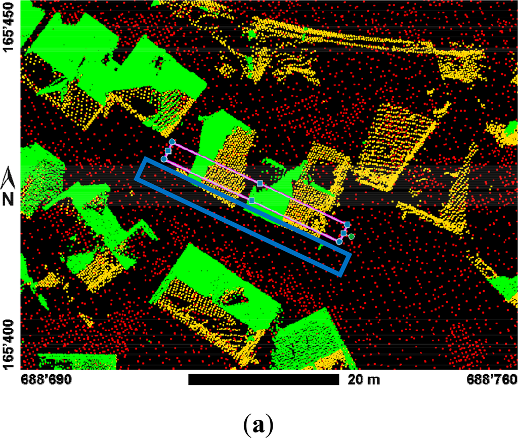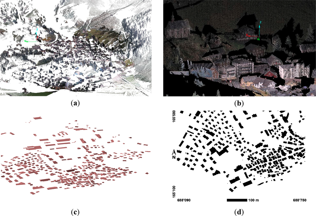 Oblique terrestrial laserscans (see Figure 3a,b) using a Leica HDS4400 long range scanner had been collected from six elevated scan positions around Andermatt [25]. The density of the point cloud data varies with distance and exposition towards scanning source but is generally in the order of 10–20 points per square meter. The average 3D point accuracy of the data in the town center is in the order of 10–20 cm [25]. This data set served as a reference for the evaluation of the extracted 3D point clouds and DSMs.