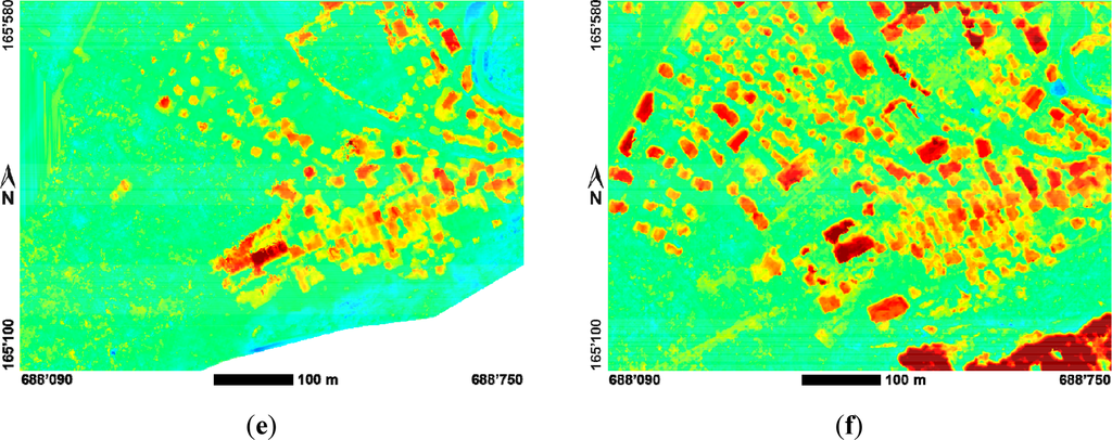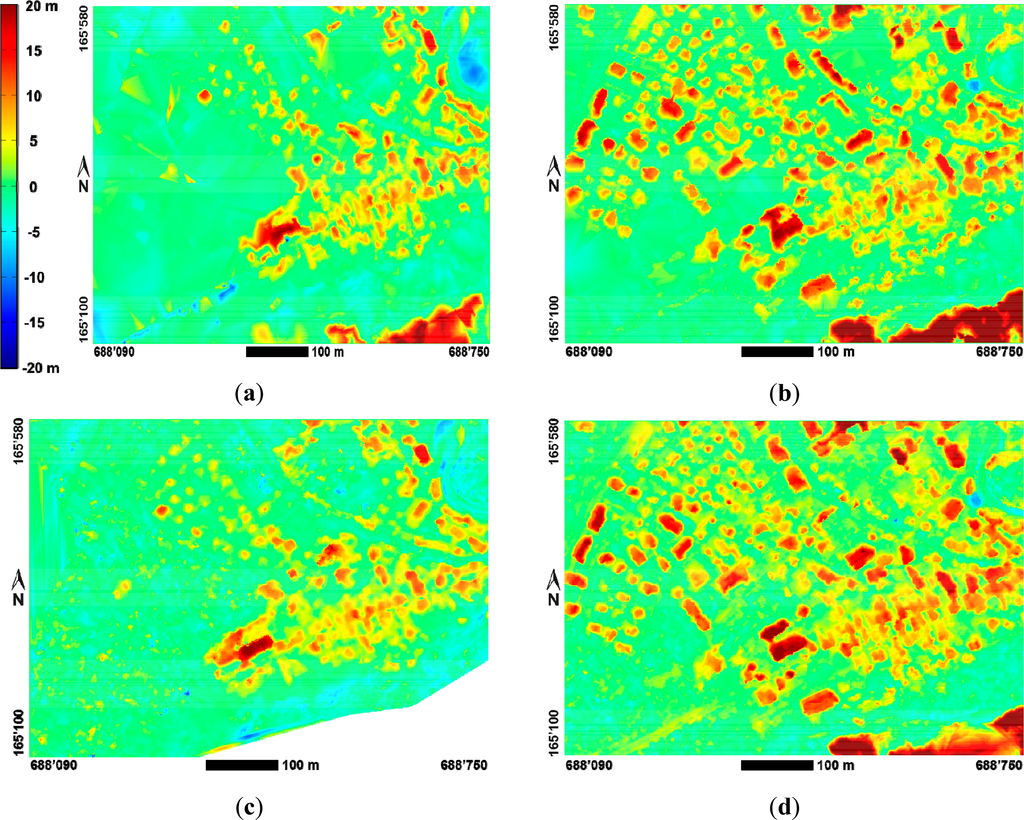 An even better comparison is offered by normalized digital surface models (nDSM) shown in Figure 5, which are calculated by subtracting the DTM (DTM-AV) from the respective DSM. Under ideal conditions, the nDSM should represent the heights of artificial or natural objects not belonging to the earth’s surface, e.g., buildings or vegetation. Figure 5 again shows the nDSMs extracted from the 1959 grayscale imagery in the left hand column and those extracted from the 2007 color imagery in the right hand column.